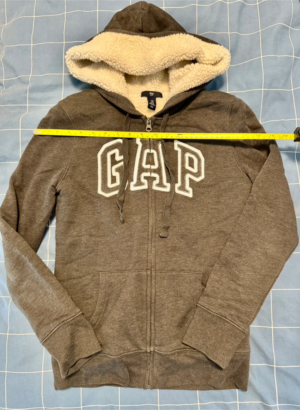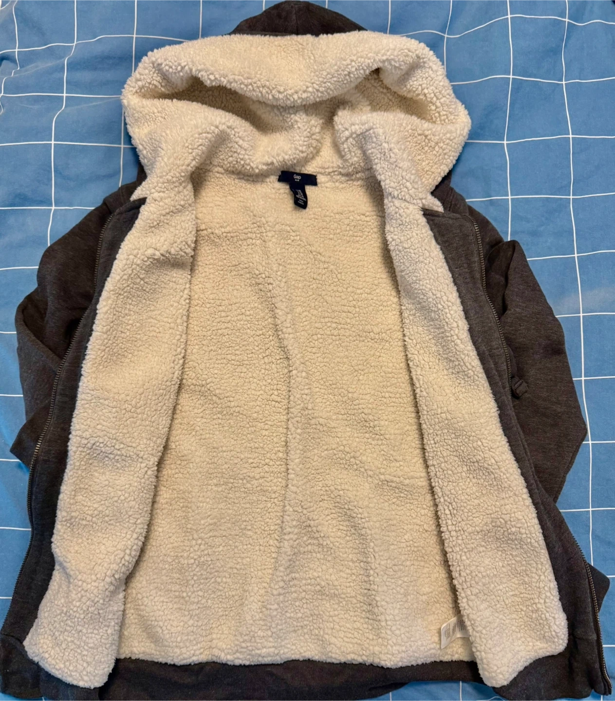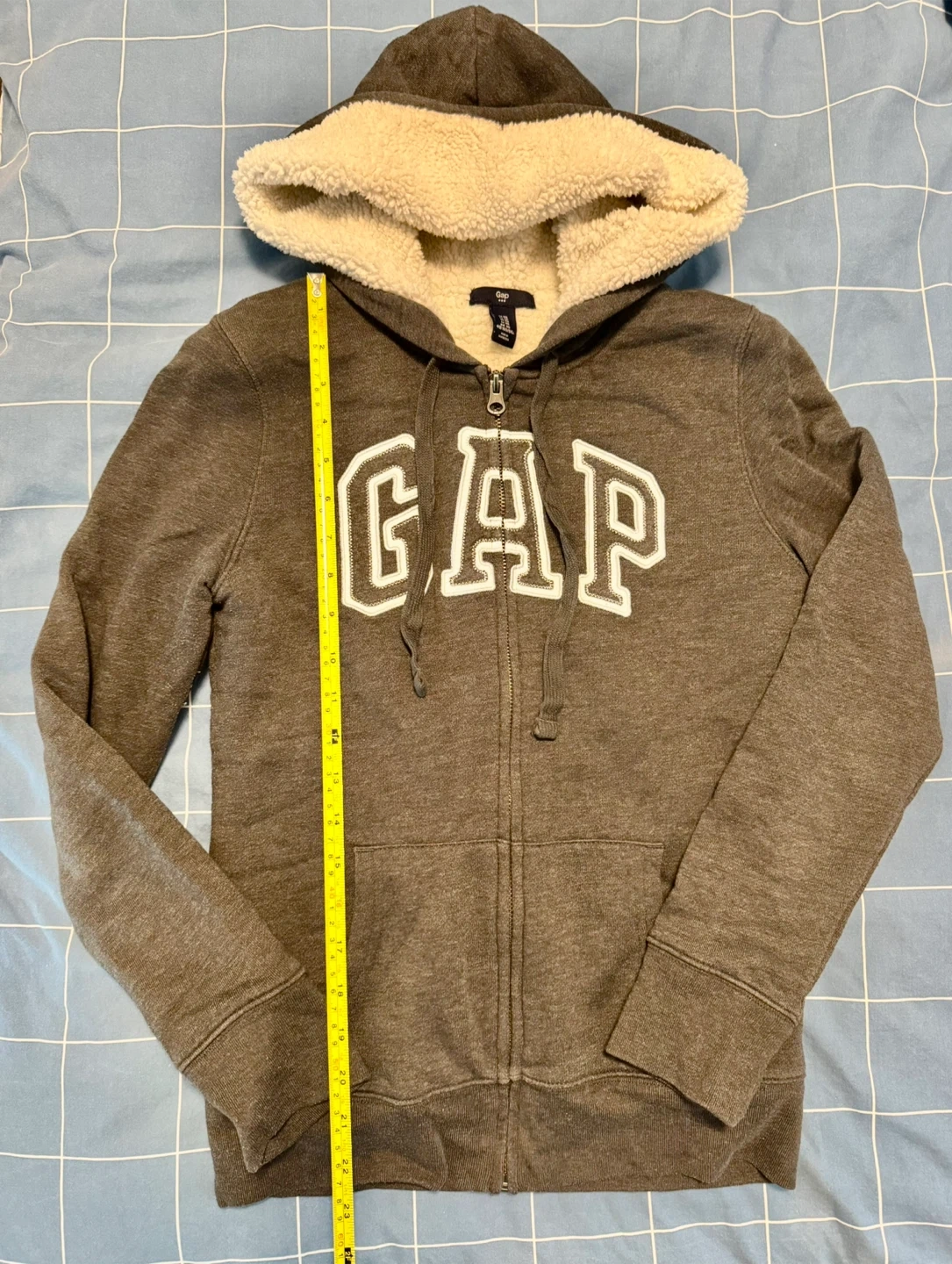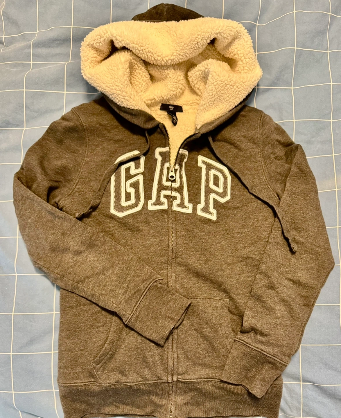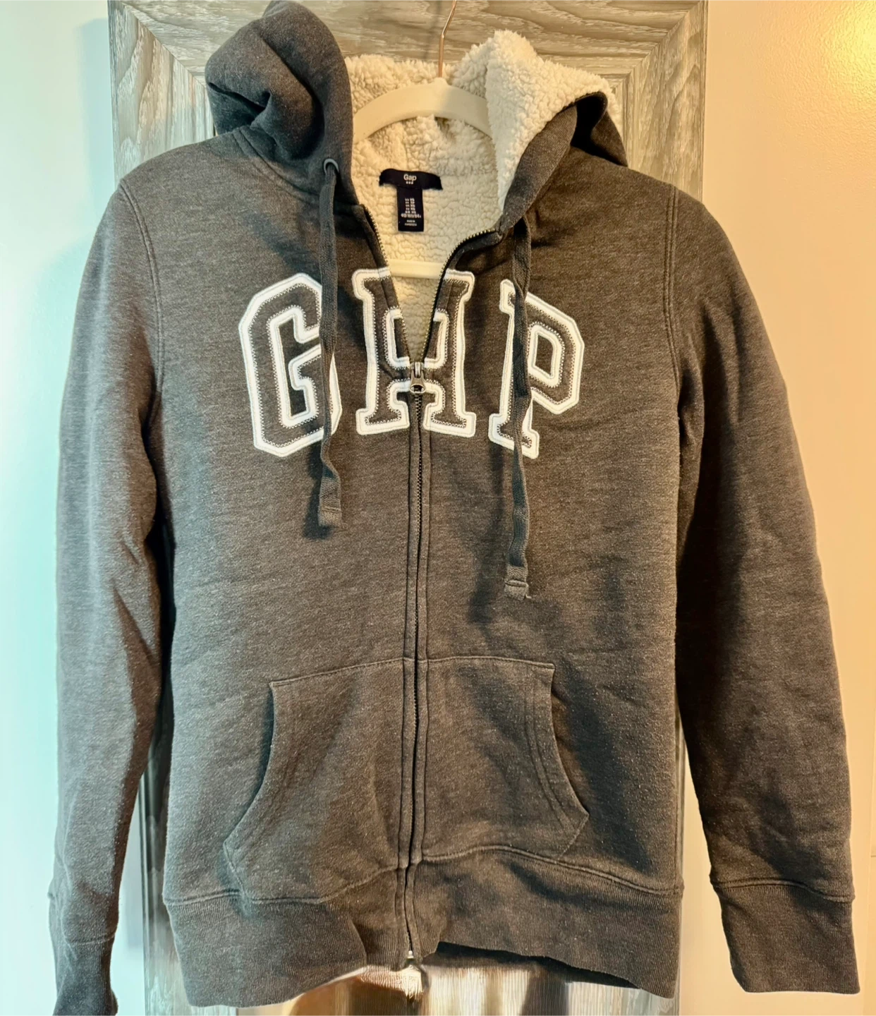 Cozy GAP hoodie with a sherpa-lined hood! It's grey and features the GAP logo on the front. Perfect for staying warm and comfy.