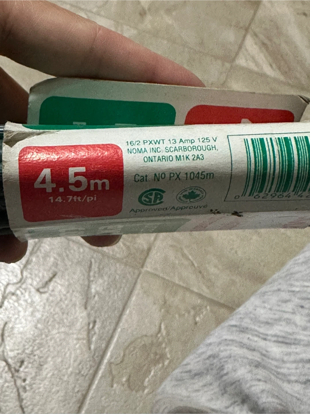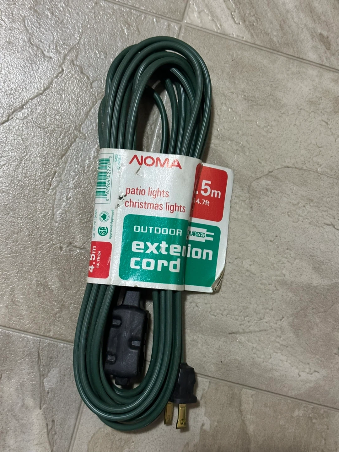 Selling a NOMA outdoor extension cord, perfect for patio or Christmas lights. It's 4.5 meters (14.7 ft) long and in NEW condition. It is an outdoor polarized extension cord with 3 outlets
