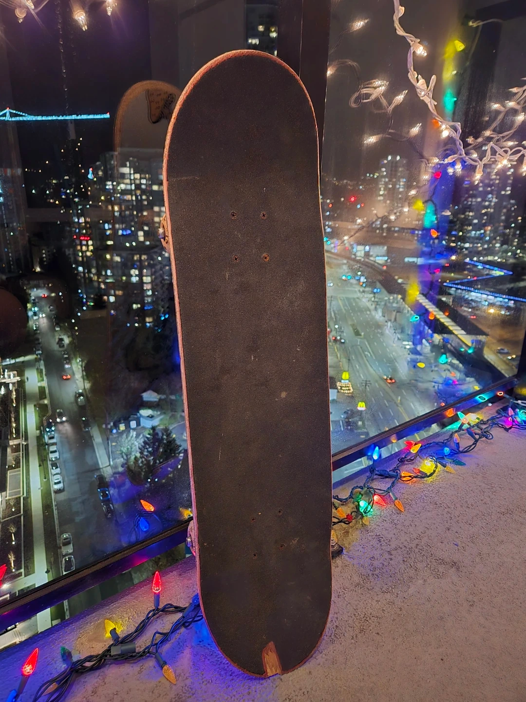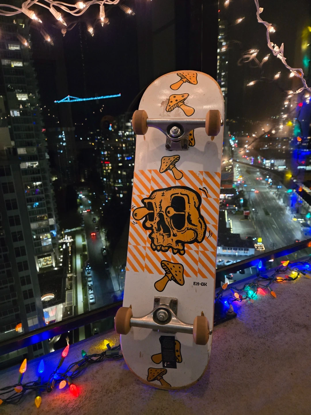 Selling a used skateboard with a cool skull and mushroom design! It's got some wear and tear, but it's still ready to ride around town. Perfect for someone looking to get into skateboarding or just needs a fun board to cruise on