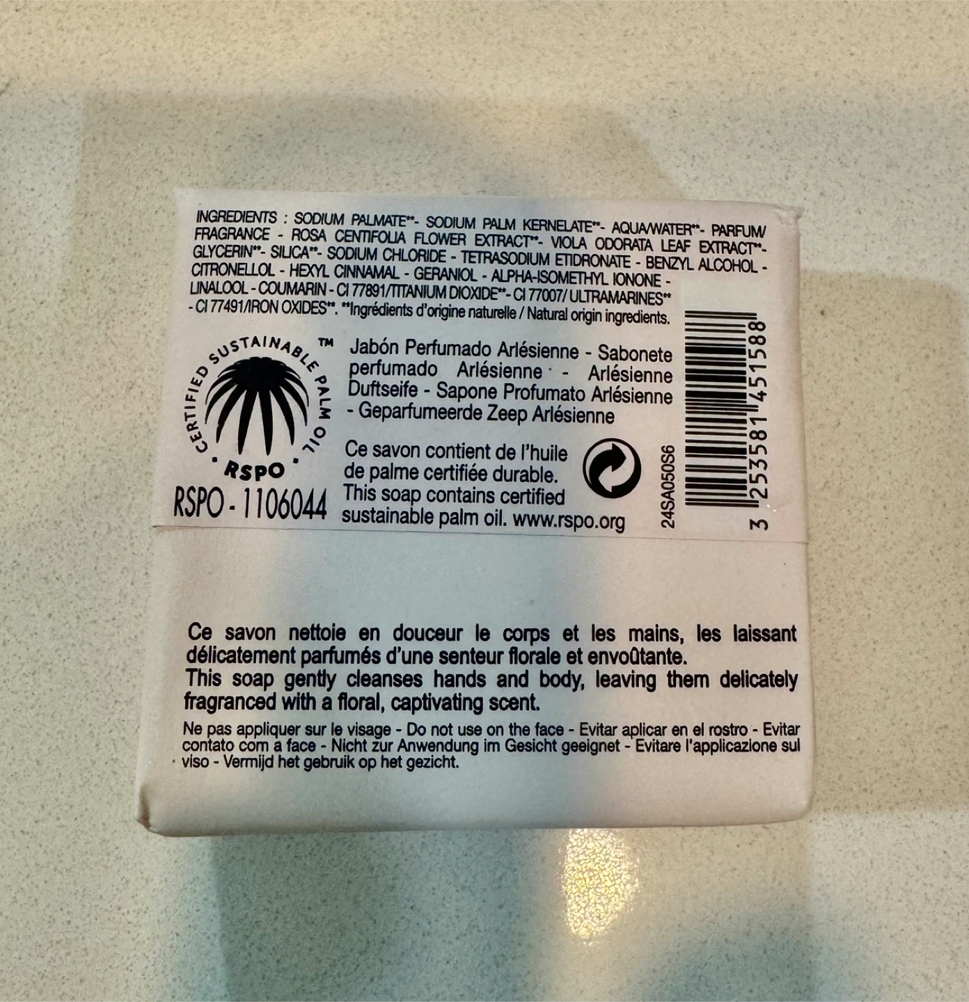 Selling a brand new L'Occitane Arlésienne Savon Perfumé Soap! It's a 50g/Net WT 1.7 OZ soap that gently cleanses hands and body, leaving them delicately fragranced with a floral, captivating scent.