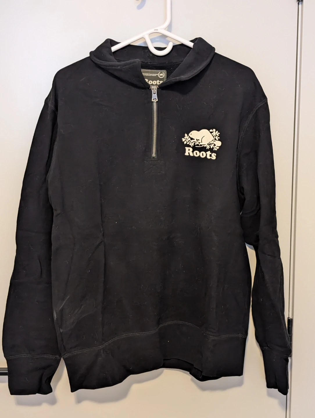 Here's a comfy black Roots half-zip pullover! It's perfect for layering or just lounging around the house. The classic Roots beaver logo is on the front, adding a touch of Canadian style to your wardrobe