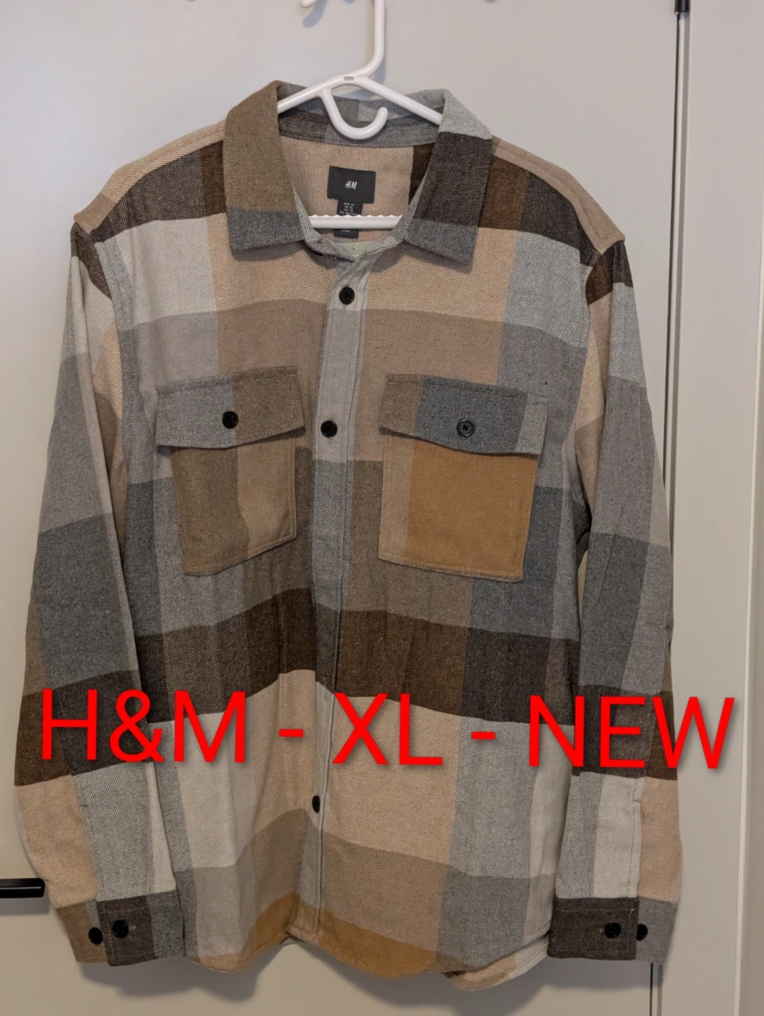 I'm selling a brand new H&M flannel shirt in size XL! It features a classic plaid pattern in neutral tones, perfect for layering or wearing on its own. Never been worn and ready for a new closet