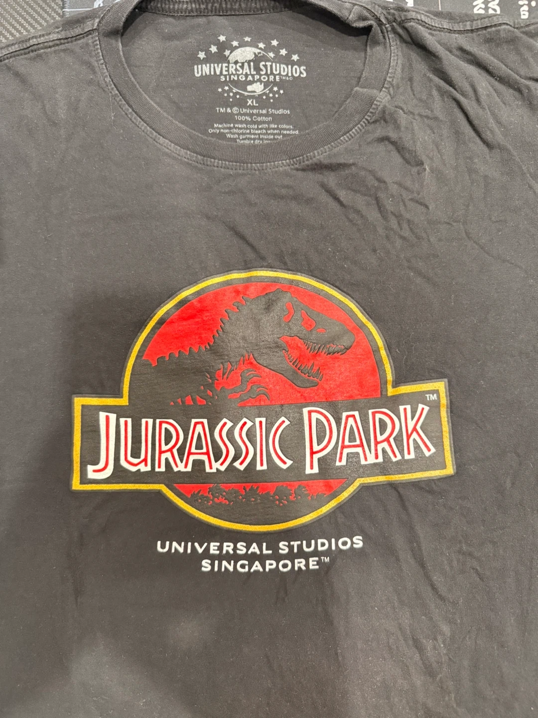 Selling a Universal Studios Singapore Jurassic Park T-shirt in size XL. It's in good condition and made of 100% cotton. Perfect for any Jurassic Park fan!