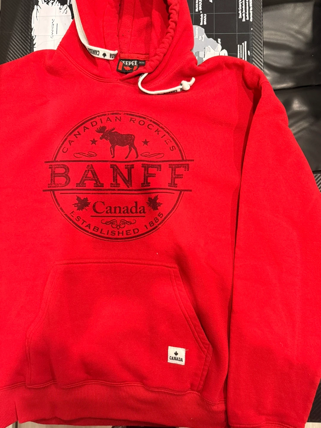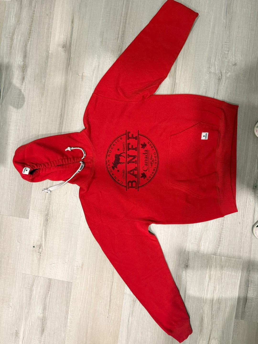 I'm selling a Keepee hoodie featuring a Banff Canada design. It's red and size medium. Great for showing off your Canadian pride!