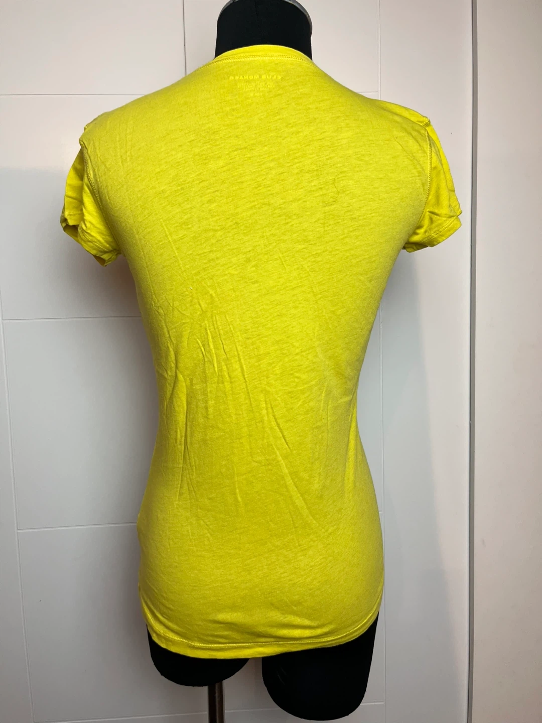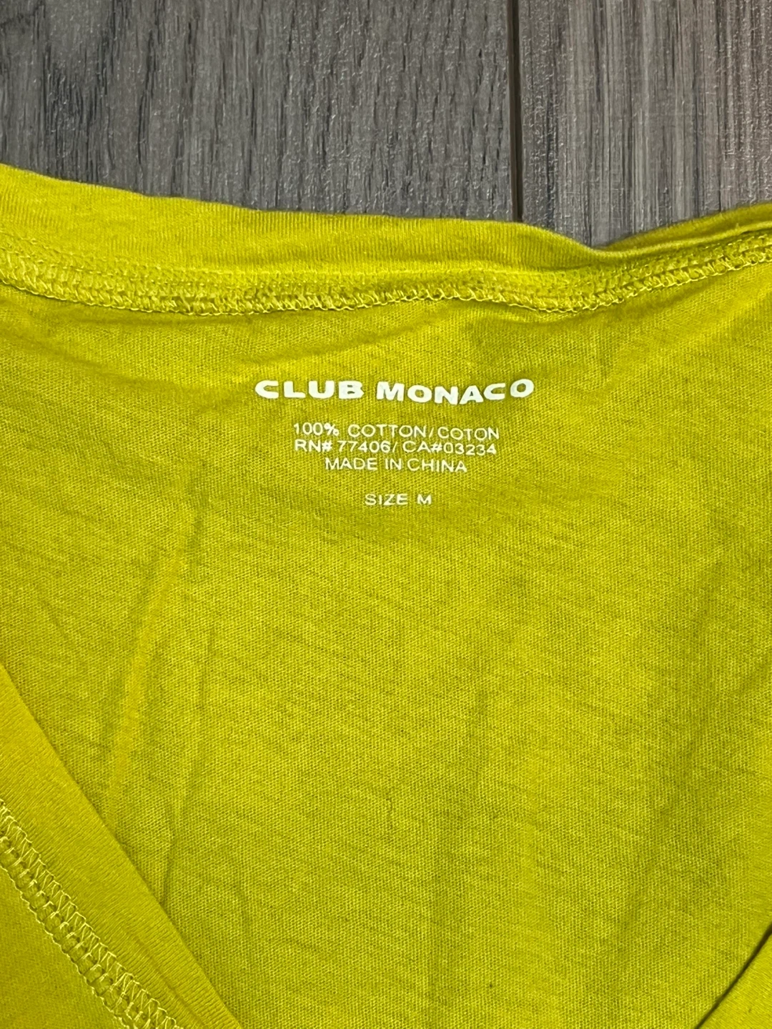 Here's a Club Monaco T-shirt in a lovely bright yellow! It's made of 100% cotton and is a size medium. A great addition to your wardrobe for a pop of colour.