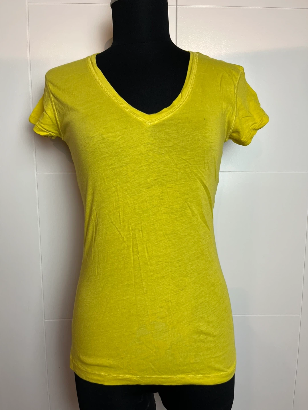 Here's a Club Monaco T-shirt in a lovely bright yellow! It's made of 100% cotton and is a size medium. A great addition to your wardrobe for a pop of colour.