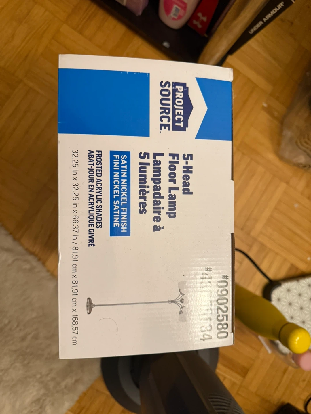 Selling a Project Source 5-Head Floor Lamp in satin nickel finish! It comes with frosted acrylic shades. The dimensions are 32.25 in x 32.25 in x 66.37 in. It's still in its original box never use never open box