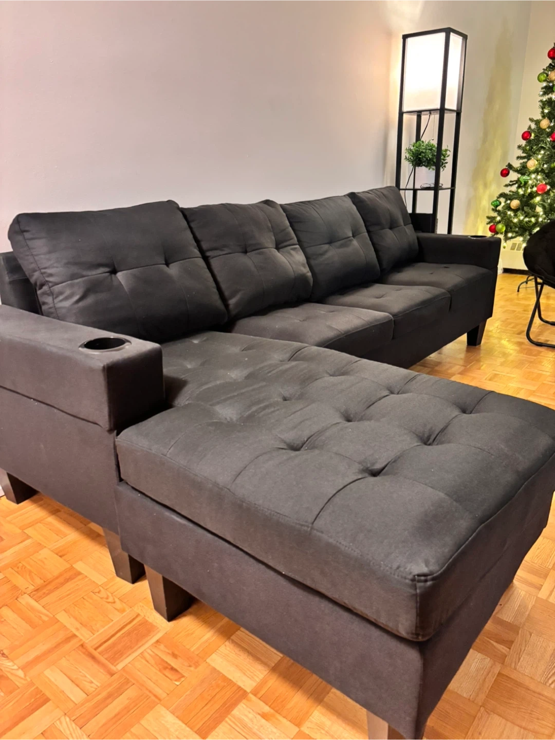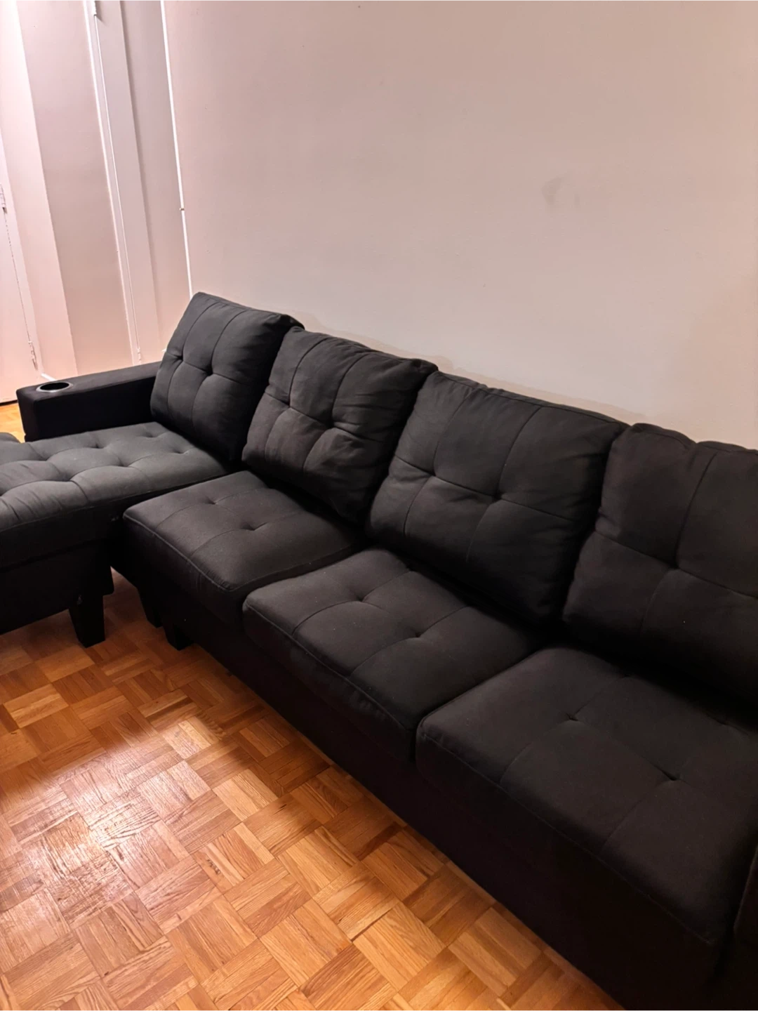 Selling a comfy black sectional sofa with an ottoman! It's in great shape and has a modern look that would fit well in any living room. The ottoman can be arranged on either side, or used as a separate piece. It has a cupholder on each end!