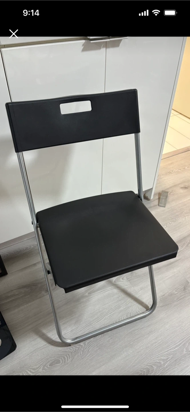 Selling 7 black folding chairs. It's in great shape and perfect for extra seating when you have guests over. Folds up easily for storage!