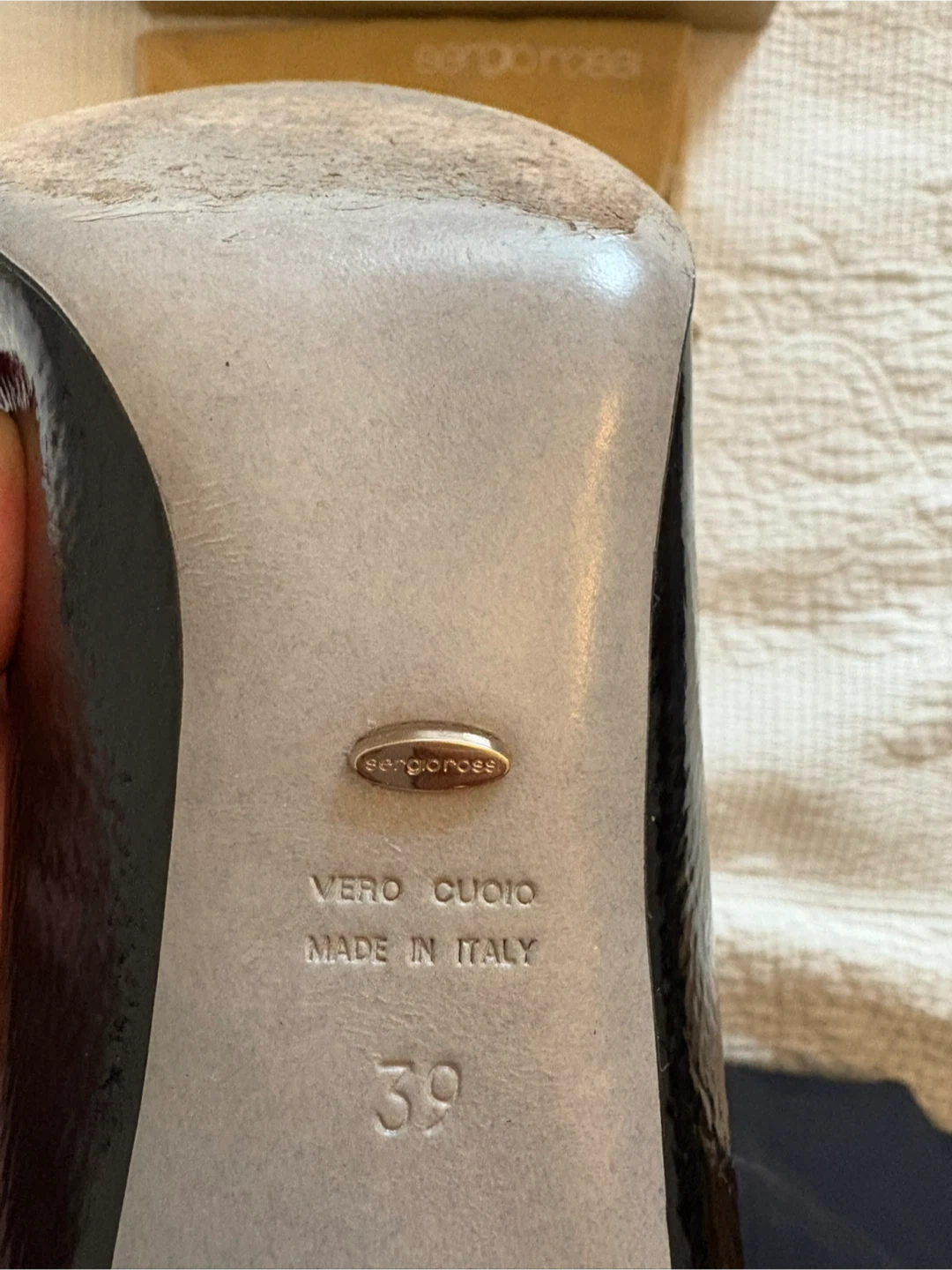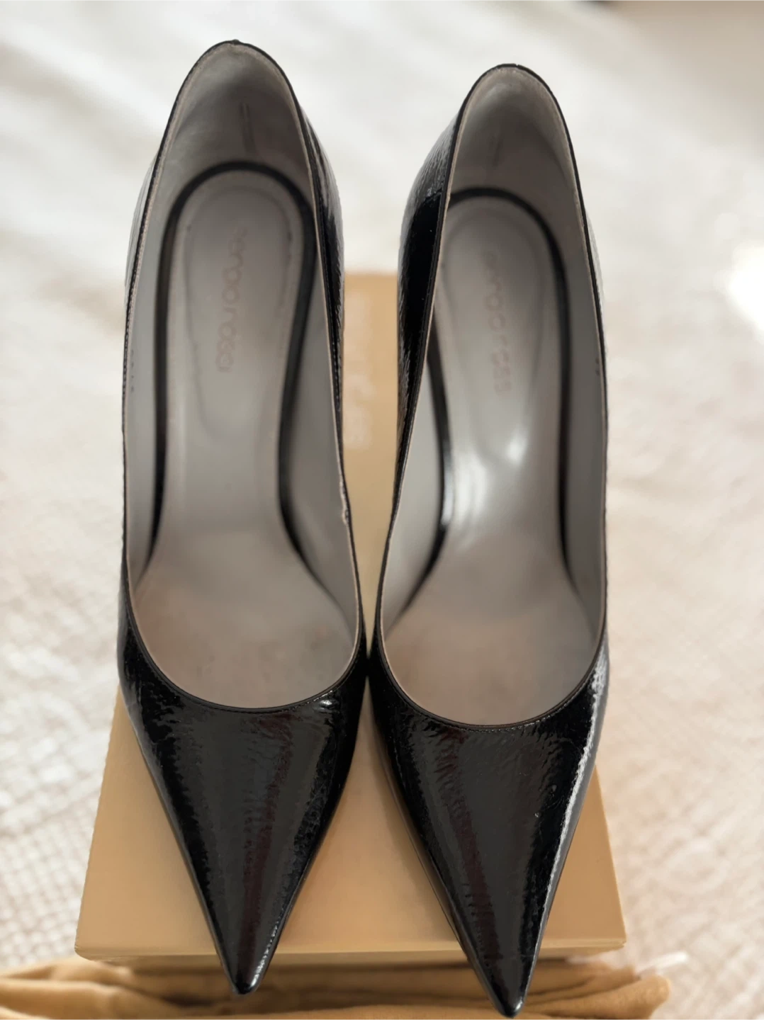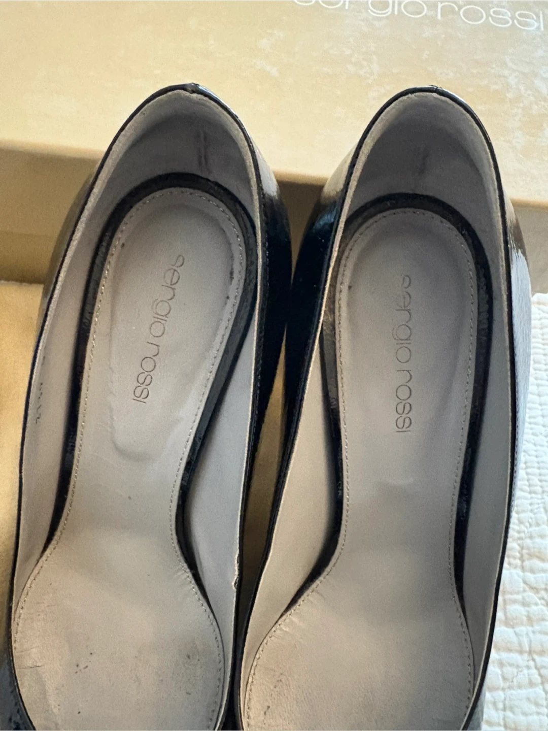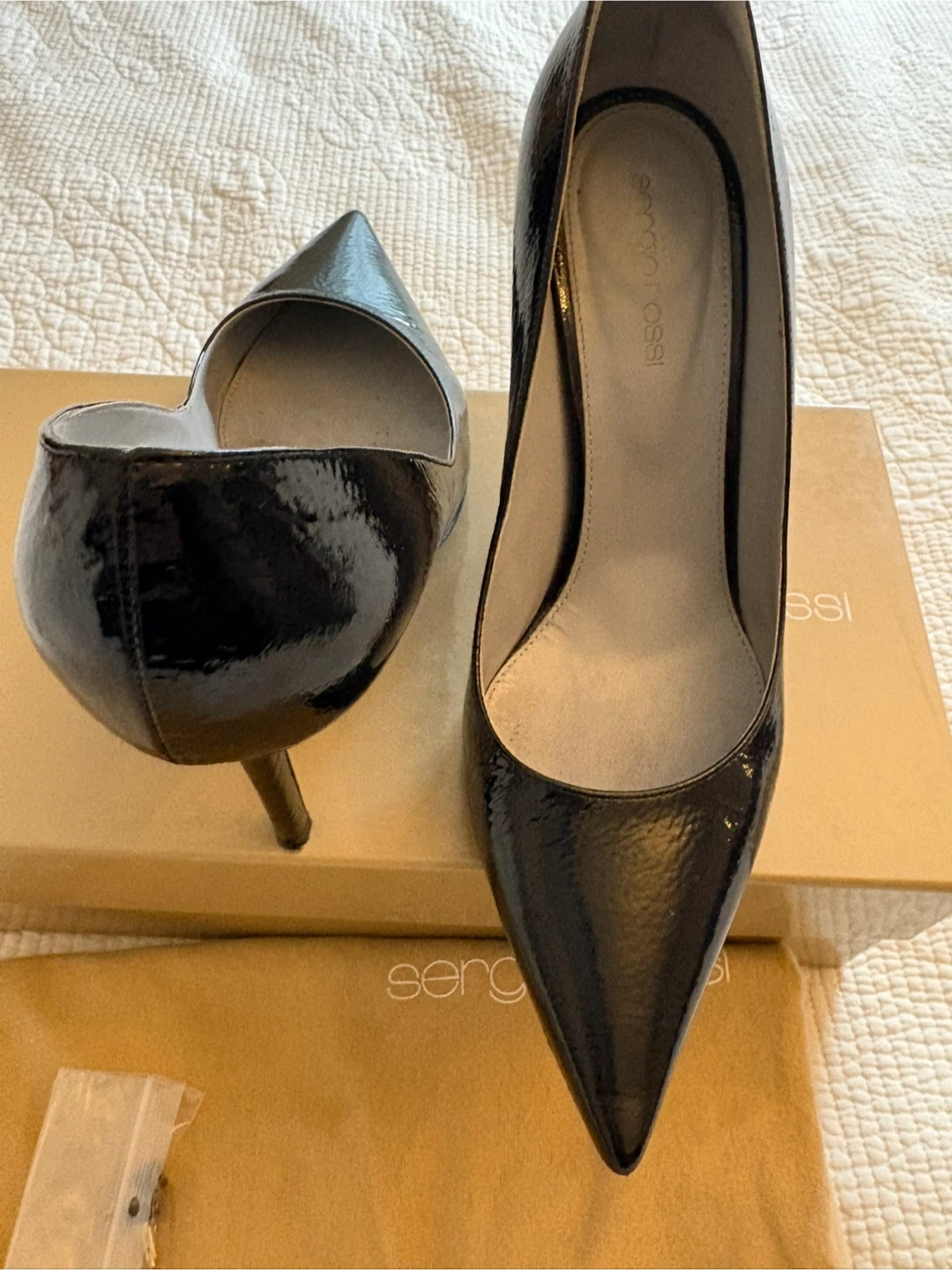 Selling a pair of Sergio Rossi black patent leather heels in size 39. They show some signs of wear, as seen in the photos, but still have lots of life left! Comes with the original box and dust bag