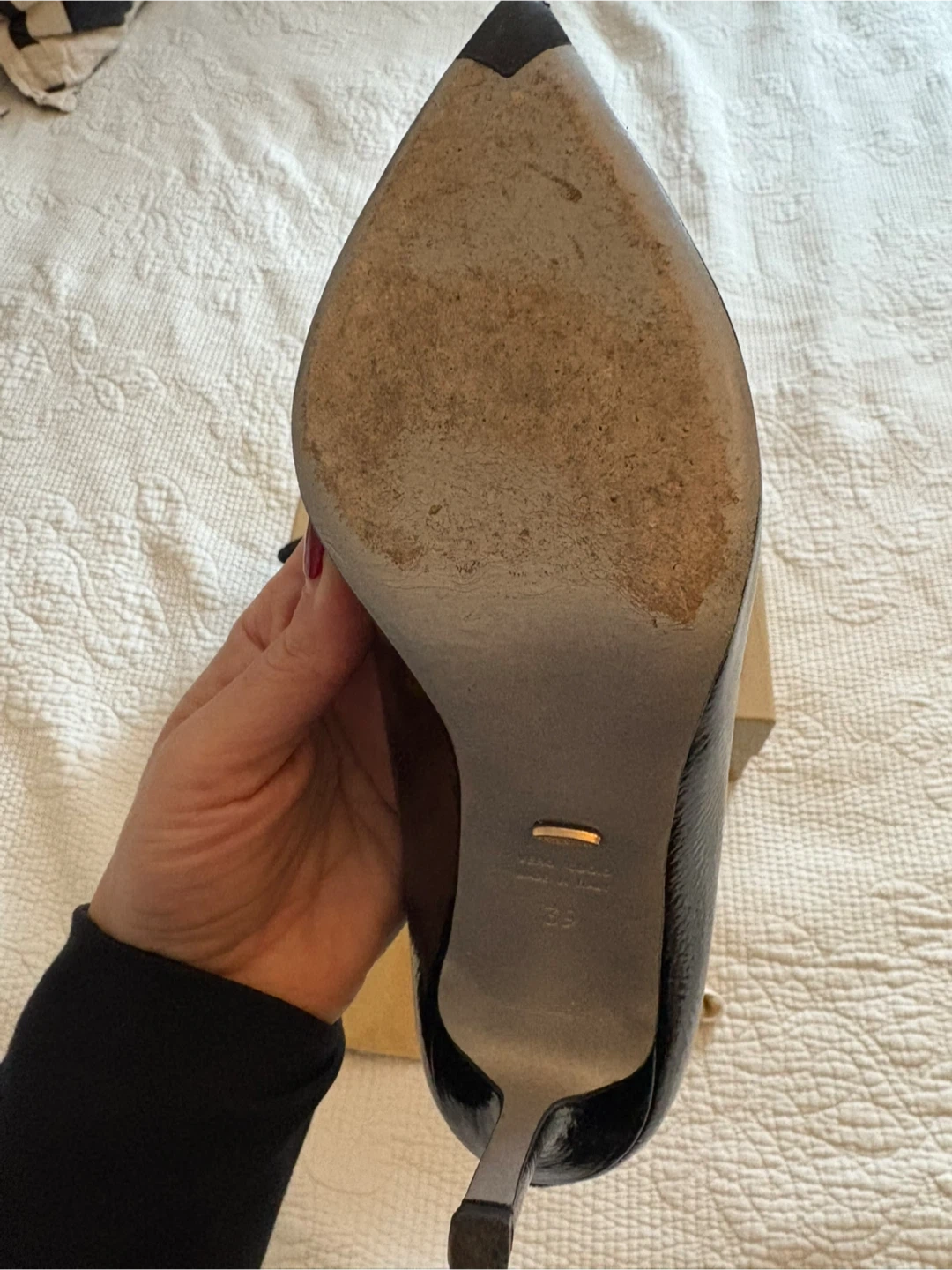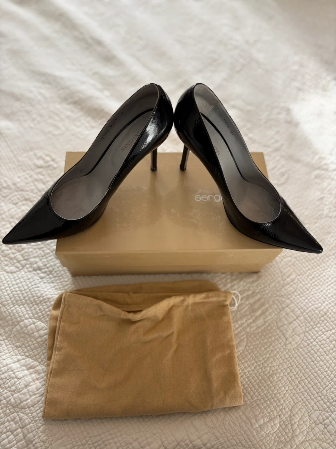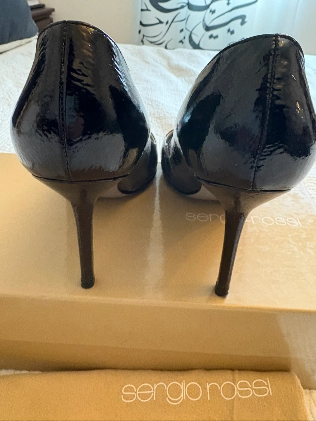 Selling a pair of Sergio Rossi black patent leather heels in size 39. They show some signs of wear, as seen in the photos, but still have lots of life left! Comes with the original box and dust bag