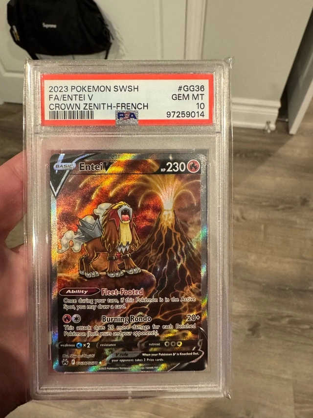 Pokémon entei v crown zenith Pokemon psa 10 it’s in English but psa graded it in French lol they said they would change for free but just seeing if anyone wants it before I do that Thanks $200