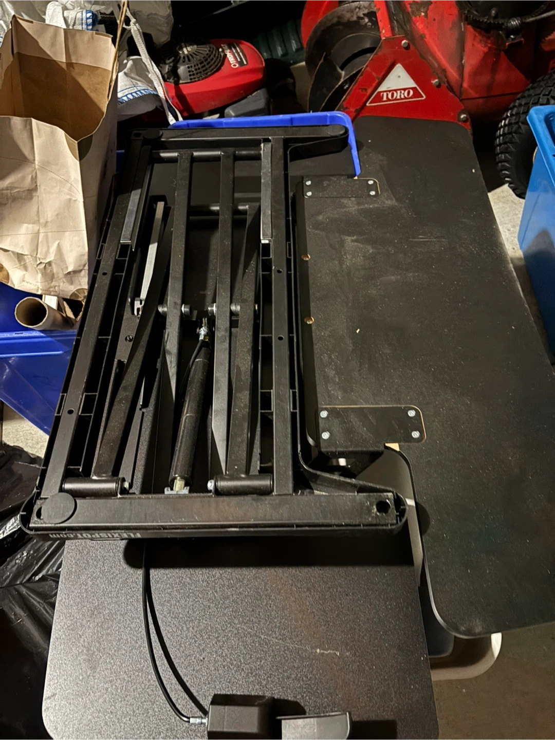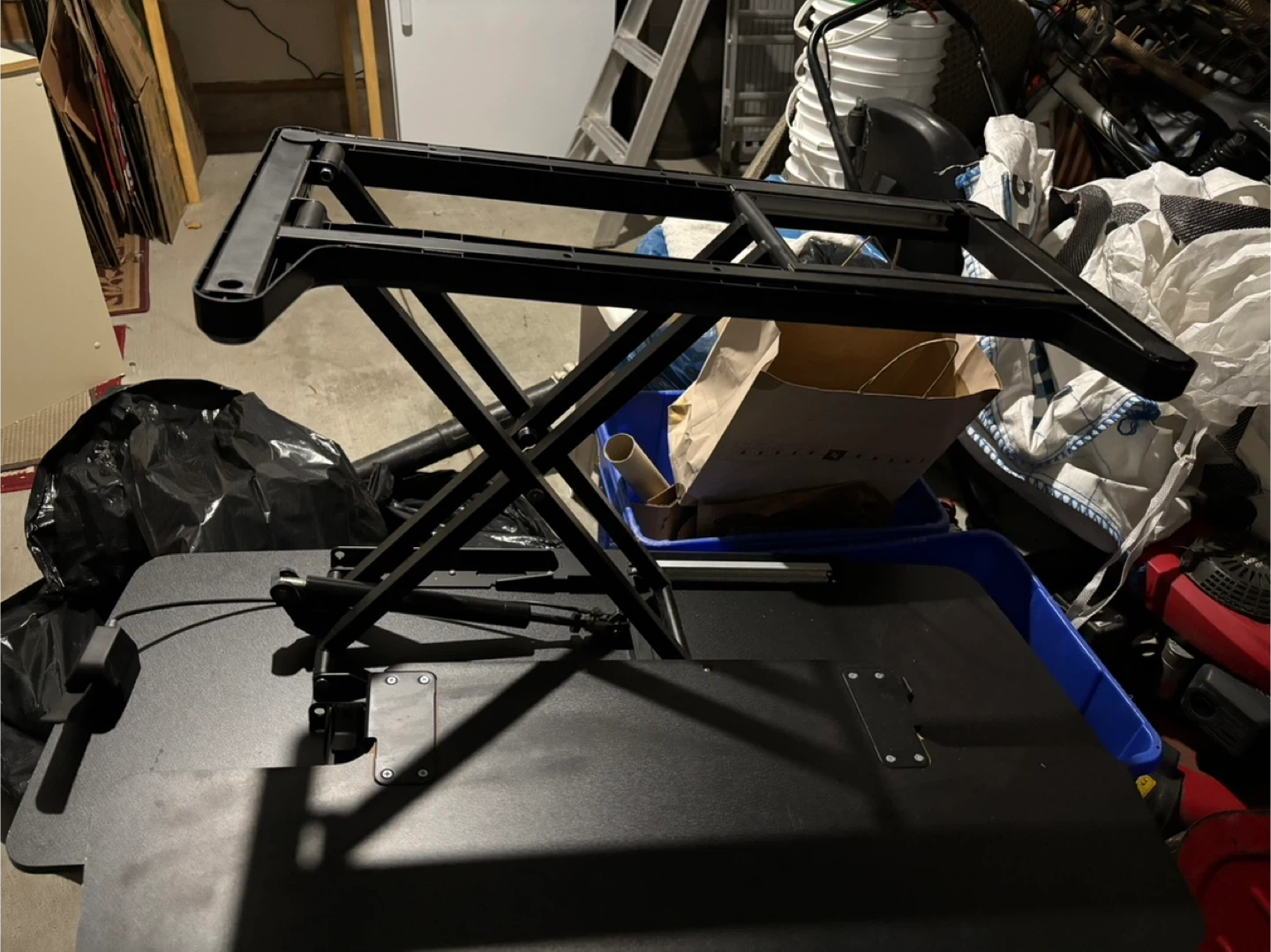 Selling an adjustable standing desk in black. It's in great condition and ready to help you work comfortably from home. It's a great option if you're looking for a standing desk!