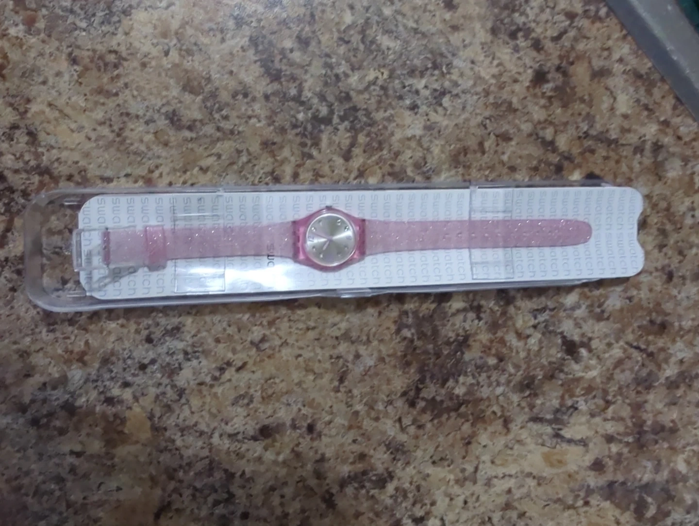 Selling a Swatch watch in a lovely pink glisten colour! It comes with its original box. This watch is perfect for adding a touch of sparkle to your everyday look. It's in great condition and ready to be worn!Needs new battery.