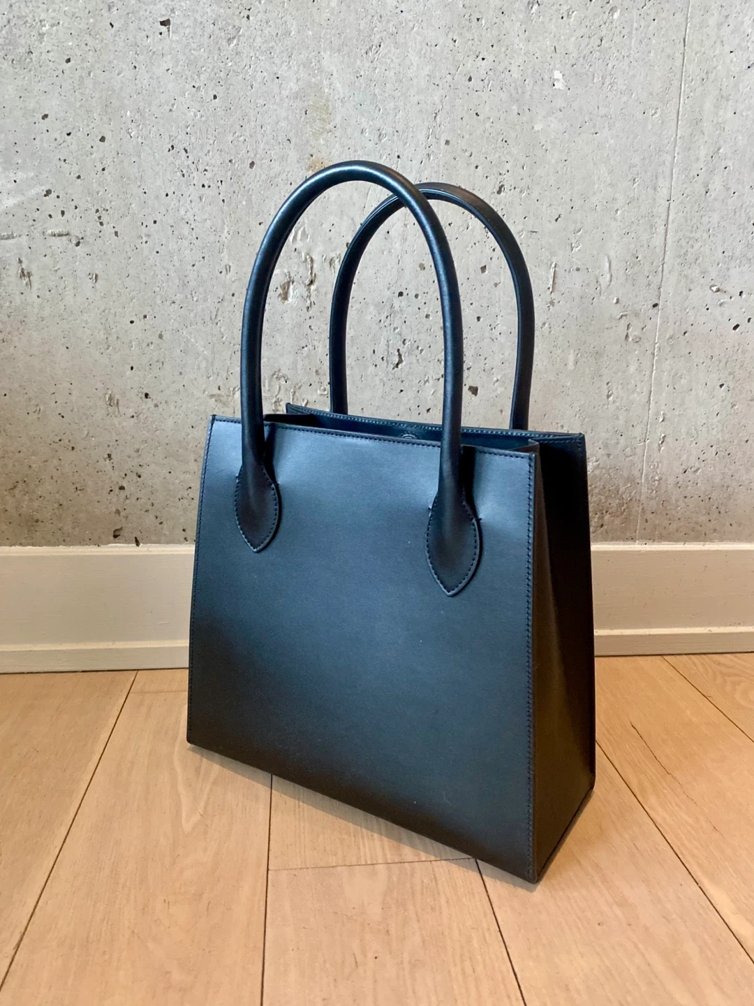 Here's a stylish black leather small tote bag that's in great condition. It's perfect for everyday use and has a classic, minimalist design. The bag is made of high-quality leather and features sturdy handles for comfortable carrying. It's a versatile accessory that will complement any outfit!