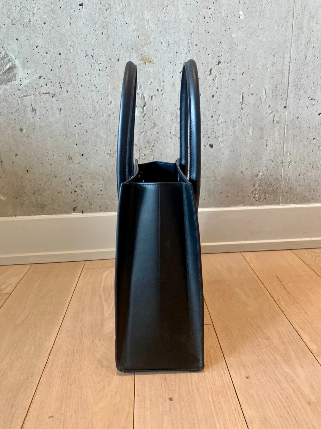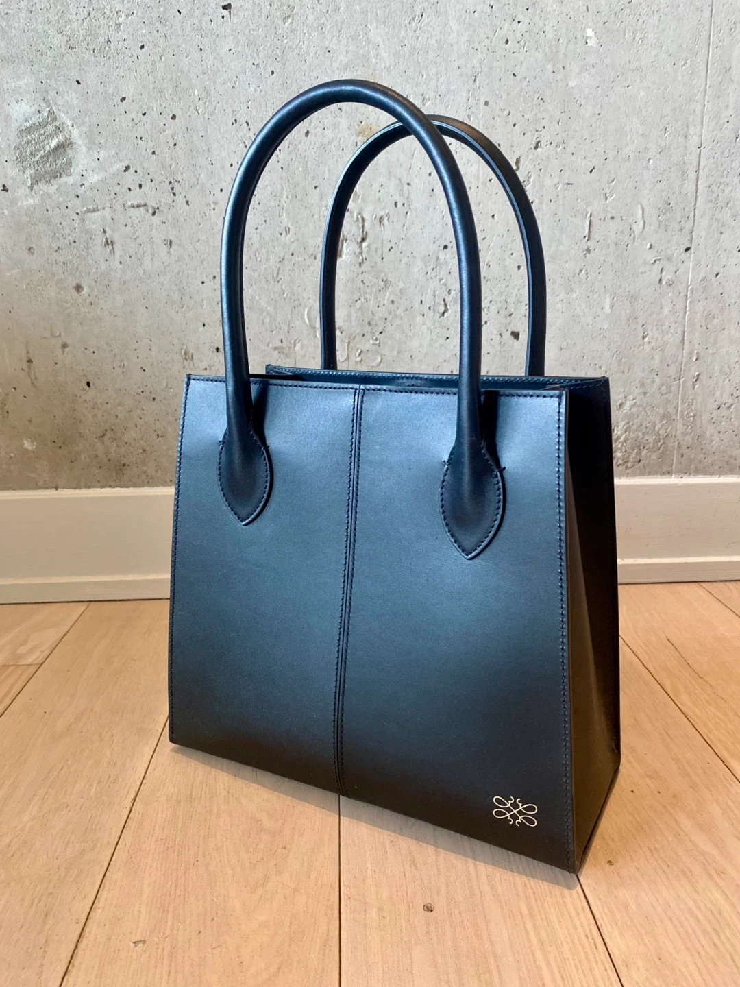 Here's a stylish black leather small tote bag that's in great condition. It's perfect for everyday use and has a classic, minimalist design. The bag is made of high-quality leather and features sturdy handles for comfortable carrying. It's a versatile accessory that will complement any outfit!