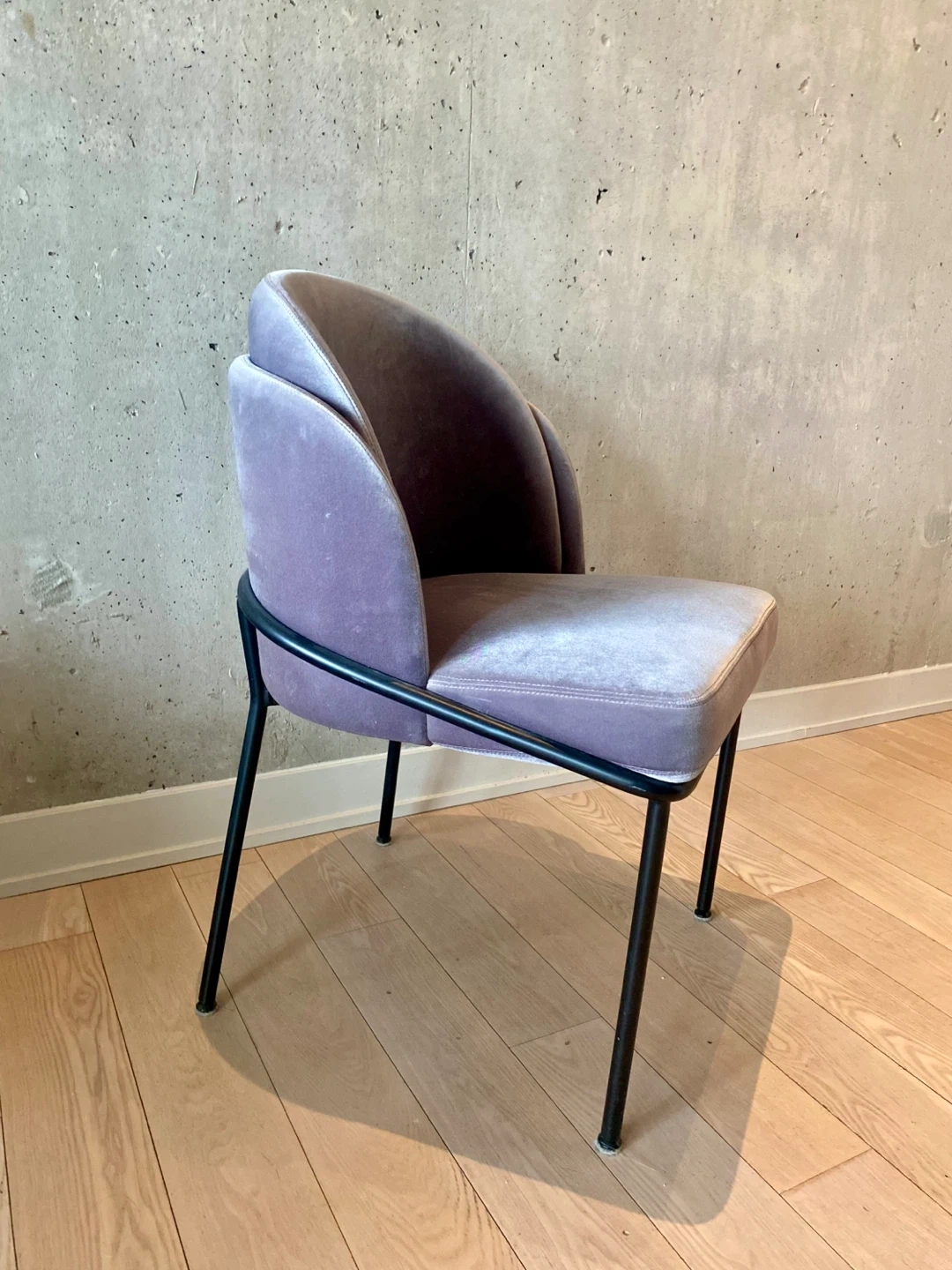This stylish accent chair from Rove Concepts features a grey velvet upholstery and sleek black metal legs. It's in great condition and would add a touch of elegance to any room!