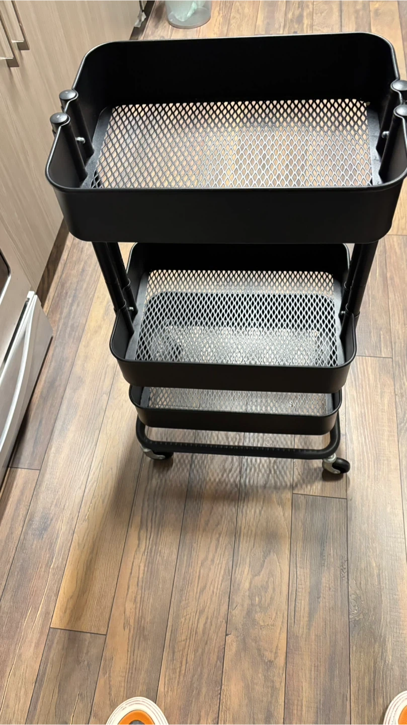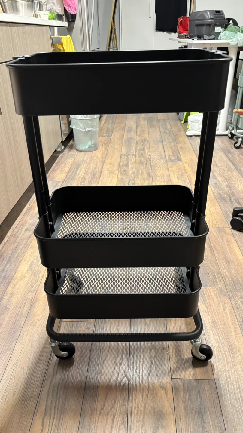 This is a three-tier rolling cart, perfect for adding extra storage space to any room! It's in great condition and ready for a new home. The black color is a nice neutral.