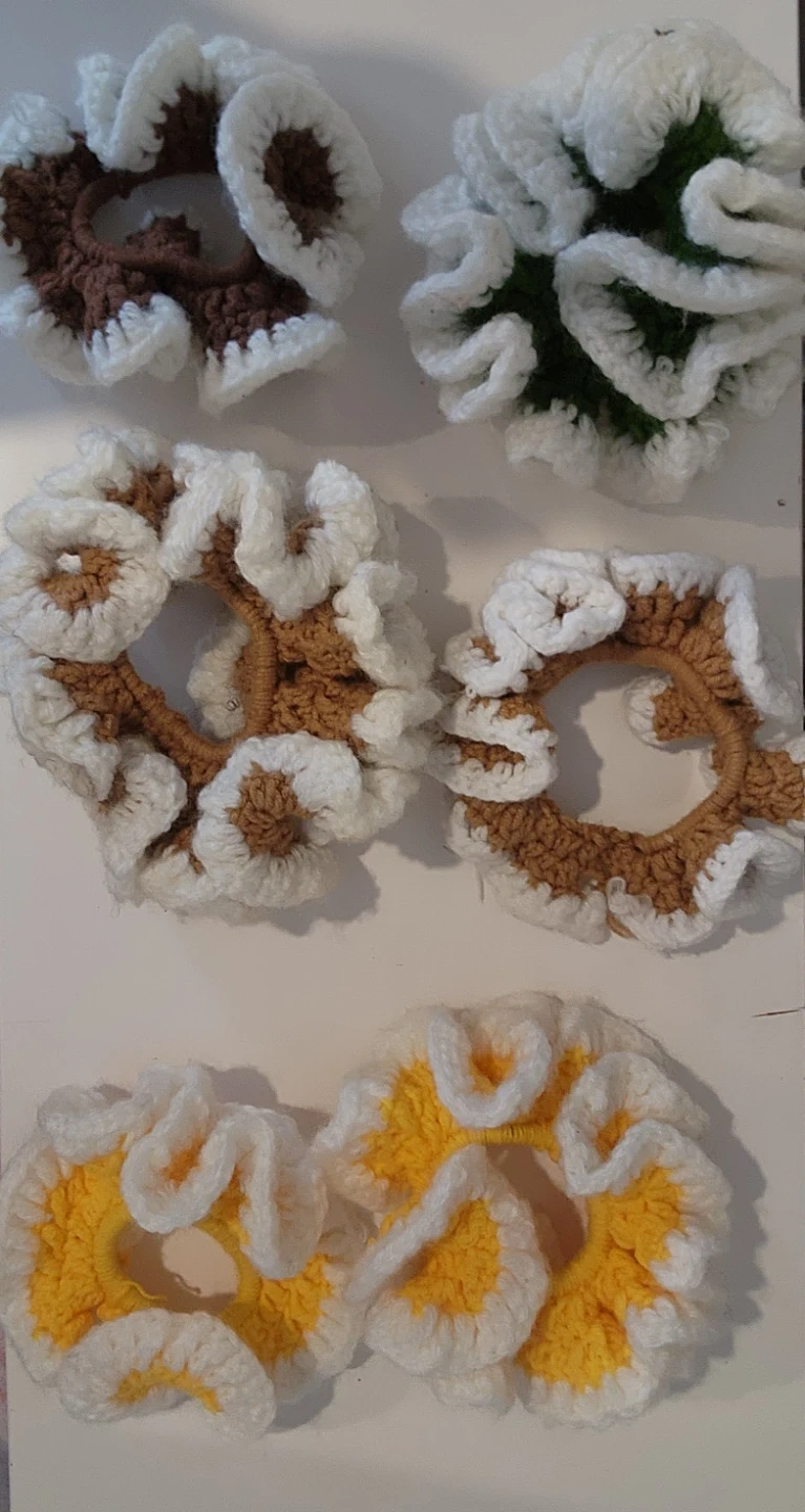 I have some adorable handmade crochet scrunchies available! They're perfect for adding a touch of handmade charm to your hairstyle. These scrunchies come in a variety of colours, including brown, green and yellow. They're all in great condition, ready to accessorize your look!