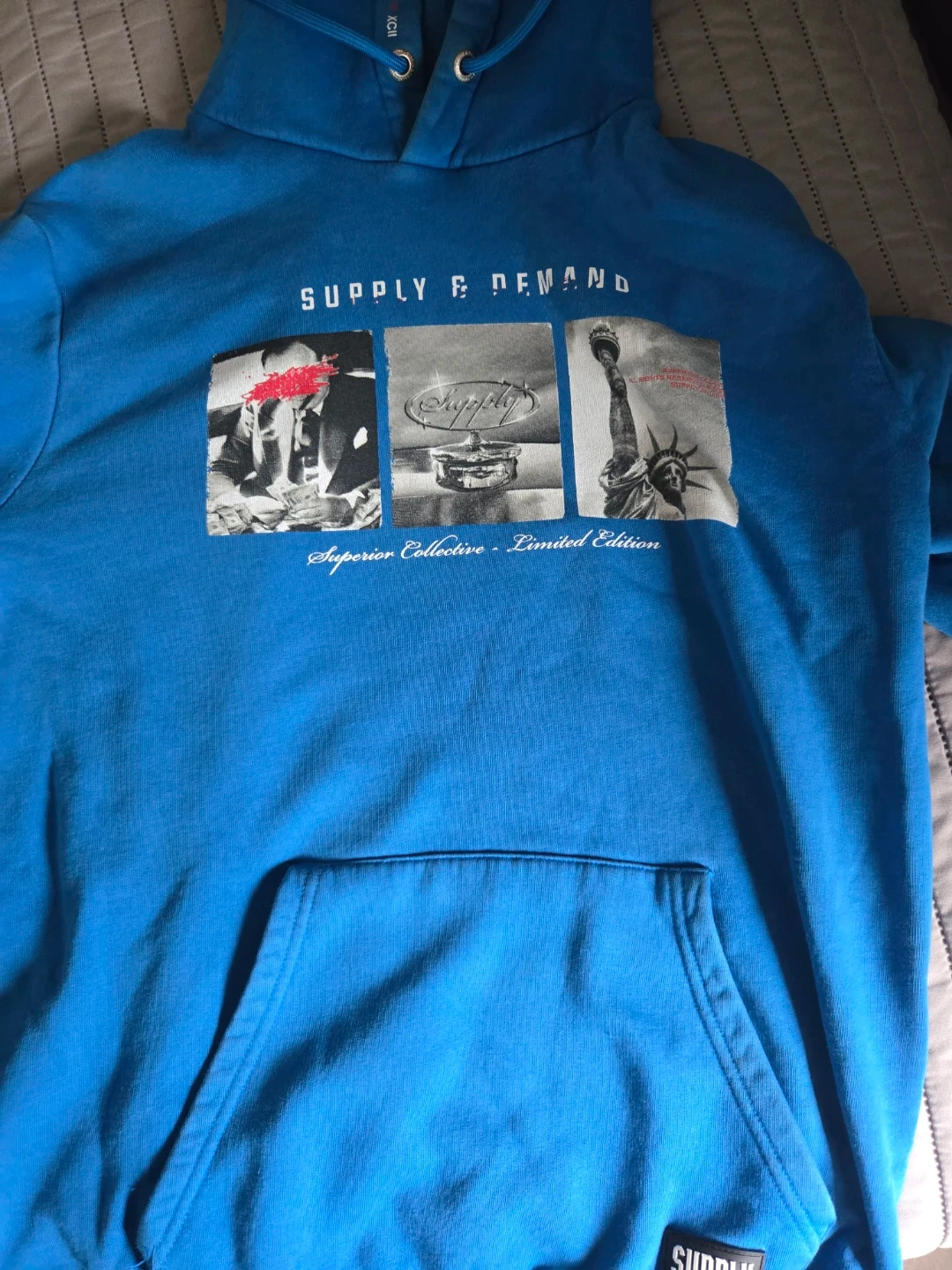 Here's a bright blue Supply & Demand hoodie! It's a Superior Collective - Limited Edition piece, featuring some cool graphics on the front. Great for adding a pop of colour to your wardrobe!