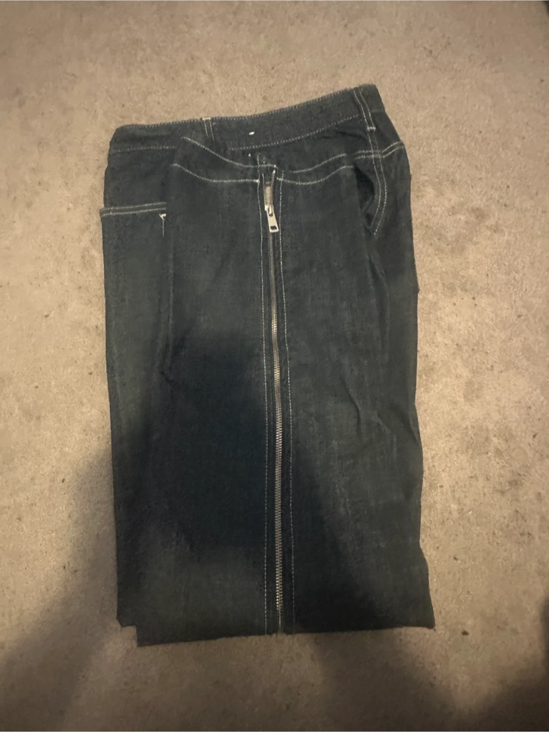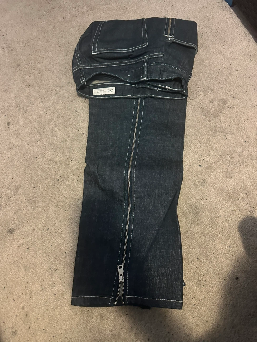 These are a pair of Zara denim jeans in a dark wash. They feature a unique zipper detail down the front. They're in great condition and ready for a new owner!