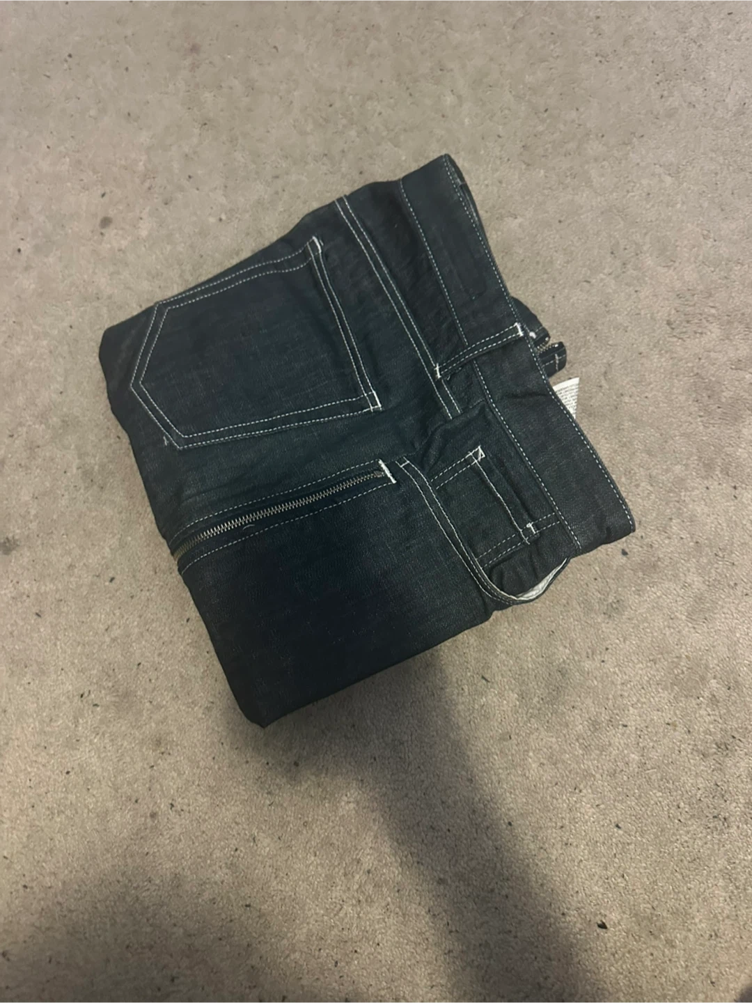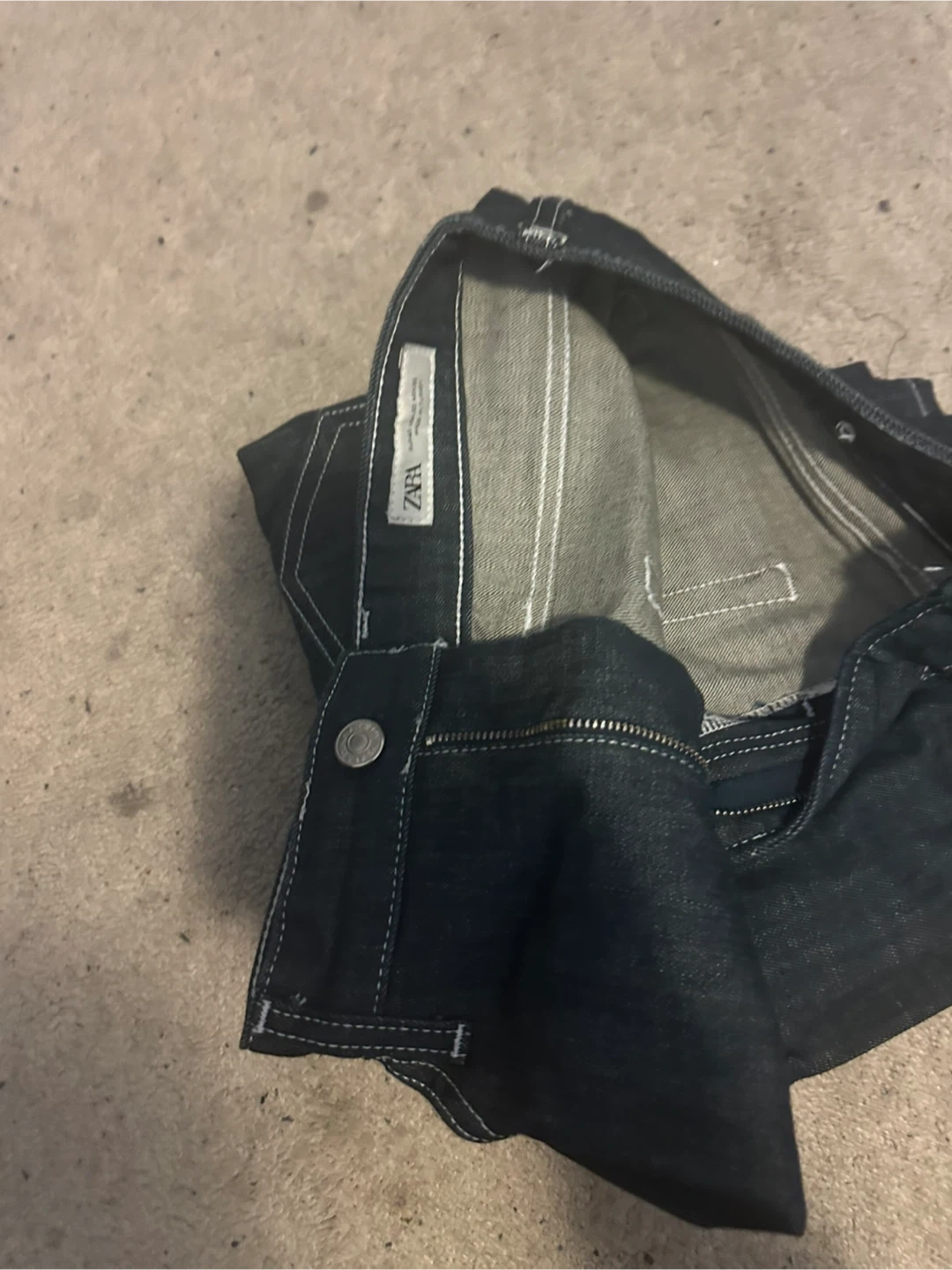 These are a pair of Zara denim jeans in a dark wash. They feature a unique zipper detail down the front. They're in great condition and ready for a new owner!