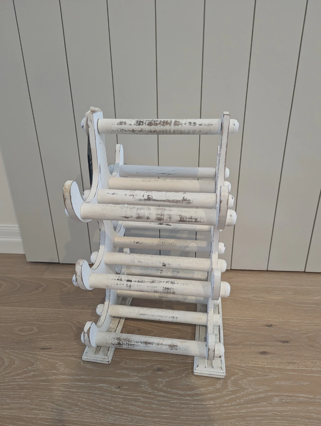 Selling a rustic white wine rack. It has a charming, distressed look and can hold several bottles of wine. Perfect for adding a touch of vintage style to your home!