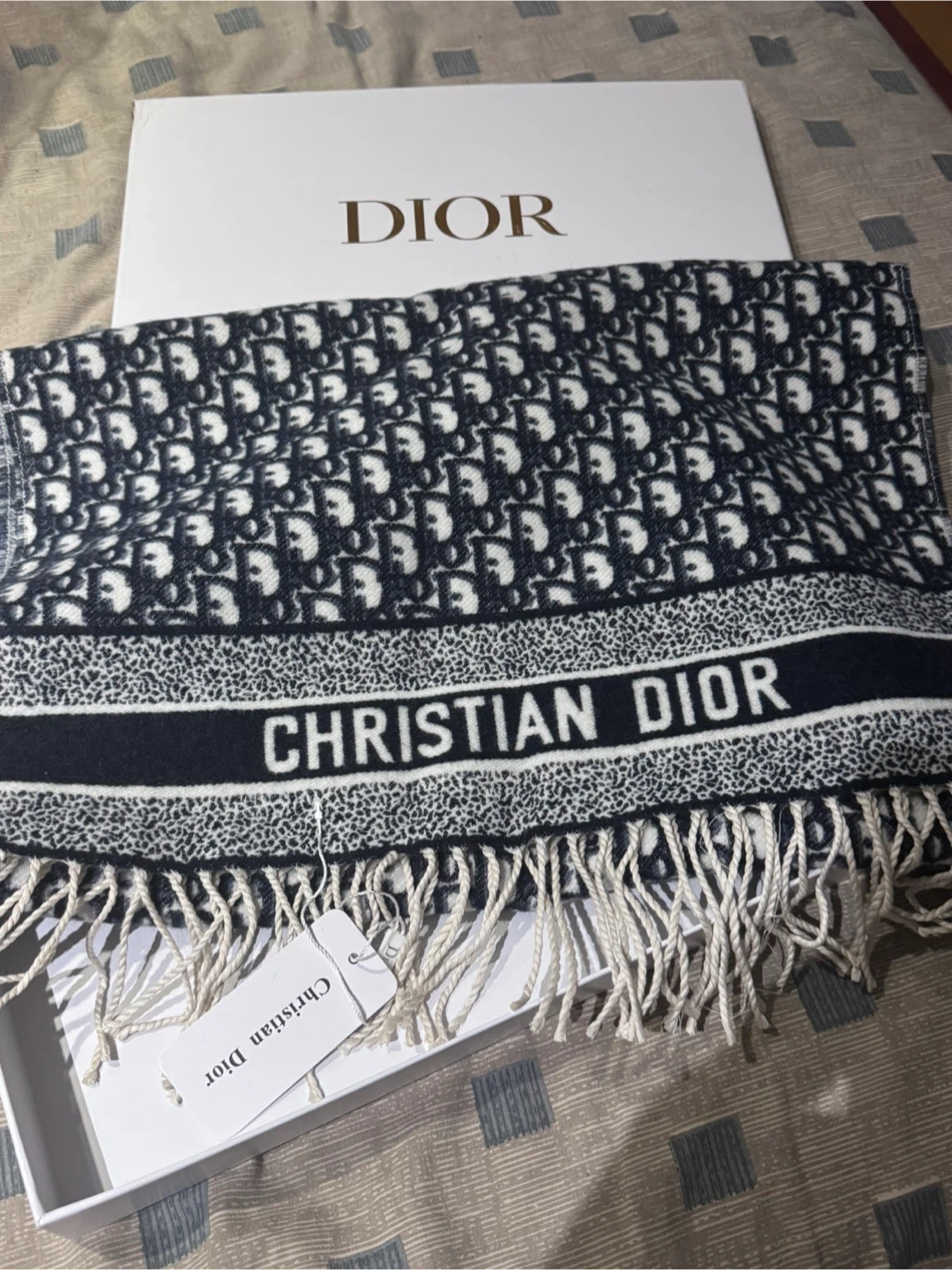 Selling a beautiful Dior Oblique scarf! It comes with the original box. The scarf features the iconic Dior Oblique pattern and has fringe detailing. It's in great condition and ready to add a touch of luxury to your wardrobe