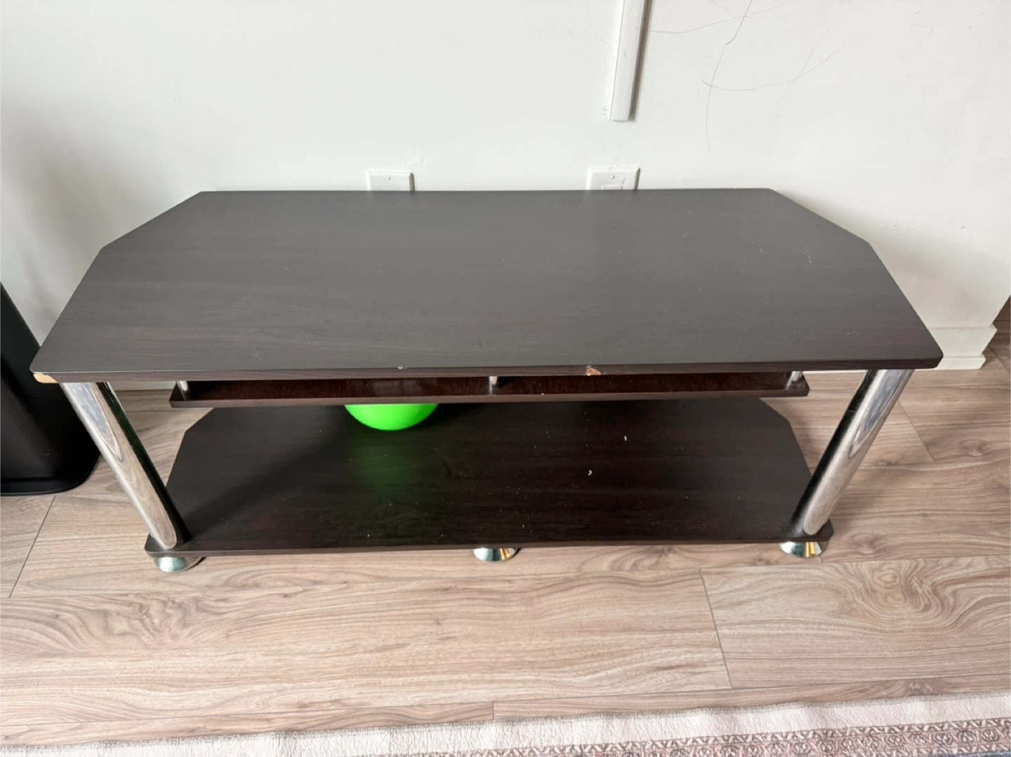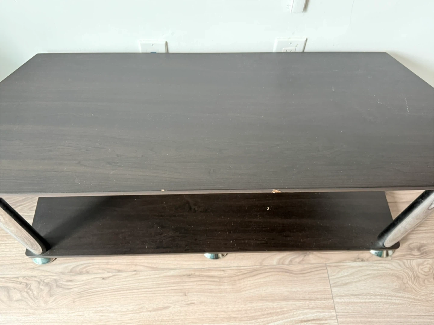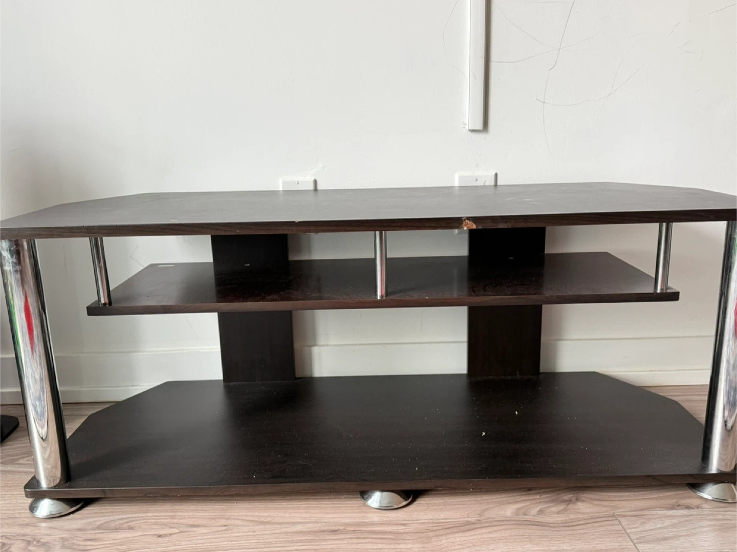 Selling a dark brown TV stand with a sleek design. It has a couple of shelves for storage and chrome-coloured legs. There is a small scratch on the top, as shown in the pictures.