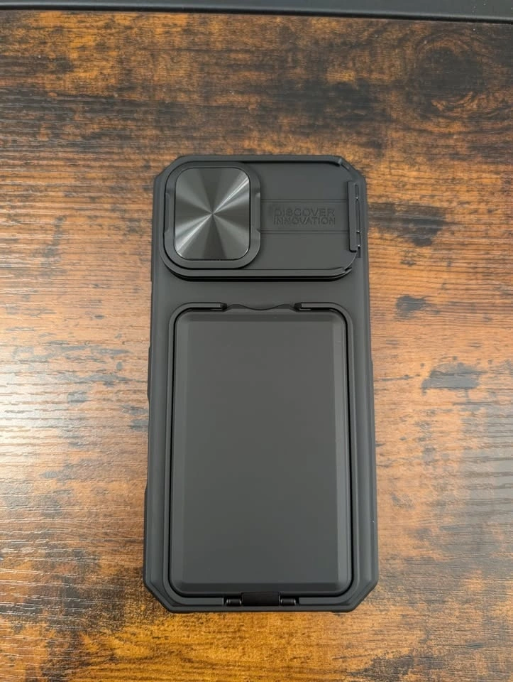 Rugged protective iPhone 17 Pro Max Wallet Case, Black. Can hold between 2 - 4 cards. Camera cover can be used as a stand.