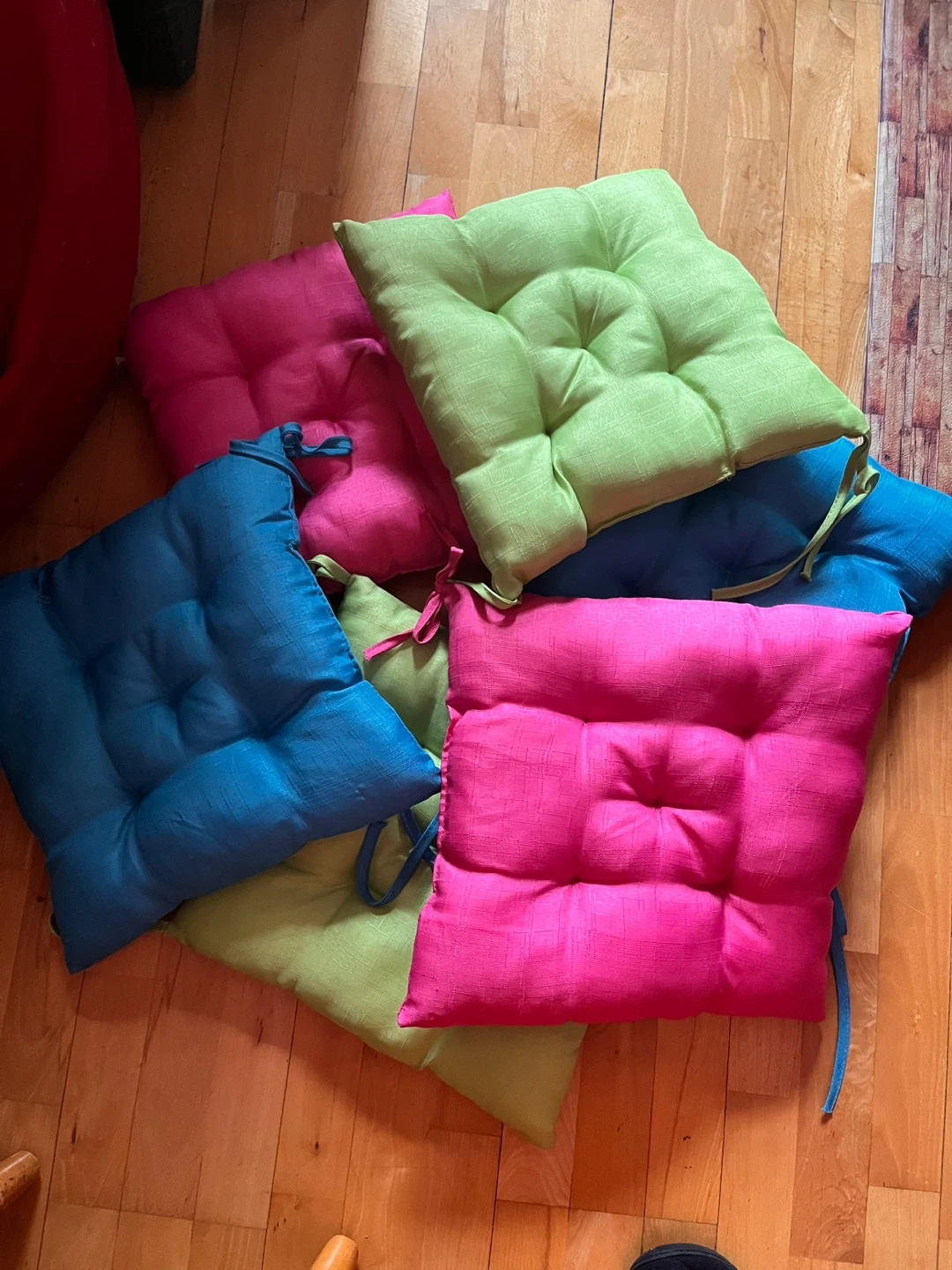 I have a few colourful chair cushions for sale! They are in good condition and would be perfect for adding some comfort and style to your chairs. Available in pink, green, and blue.