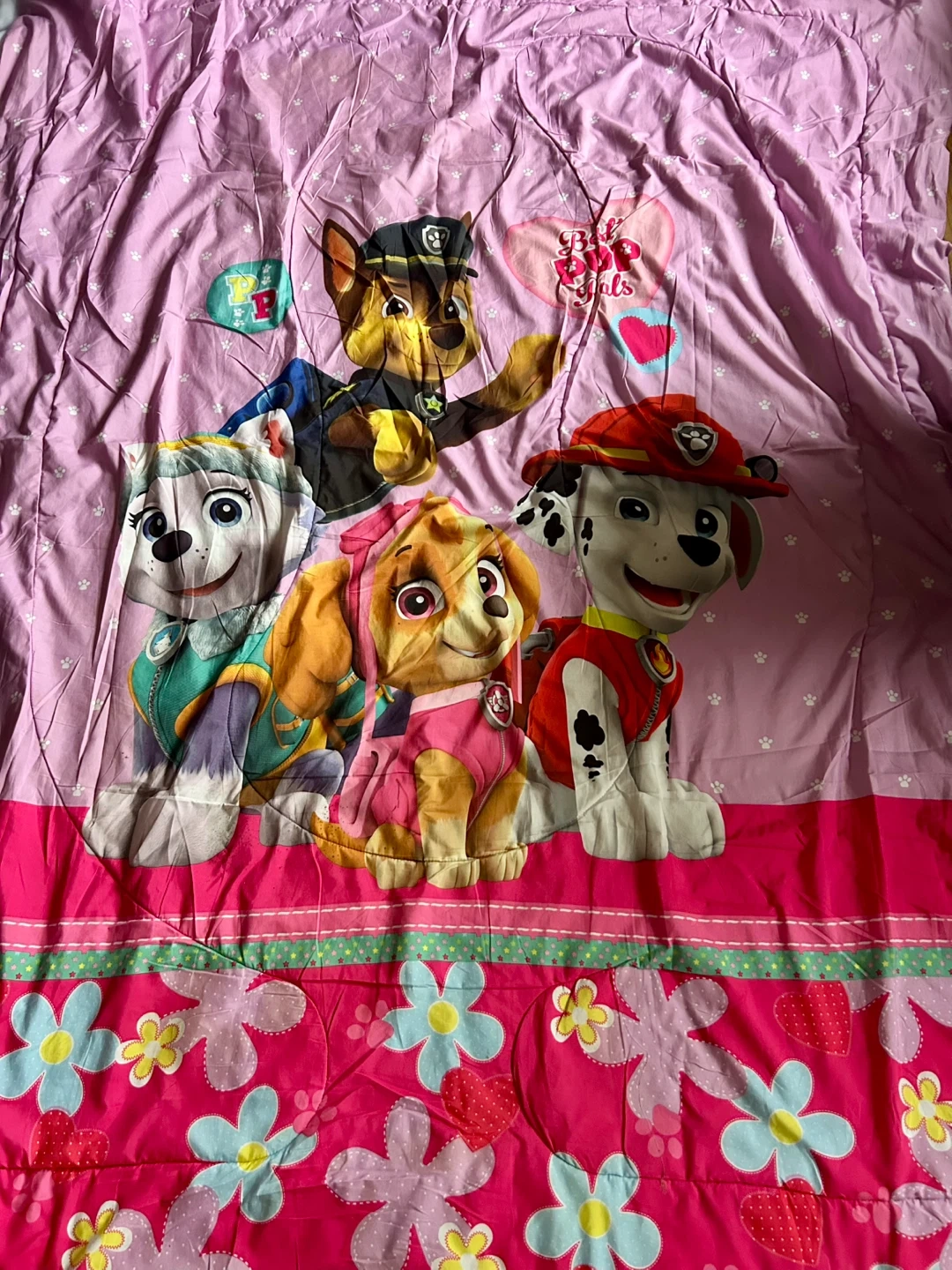 Selling a Paw Patrol themed conforter. It features Chase, Skye, Marshall and other characters. The bedding has a pink and white paw print design, with a floral and heart pattern on the bottom.