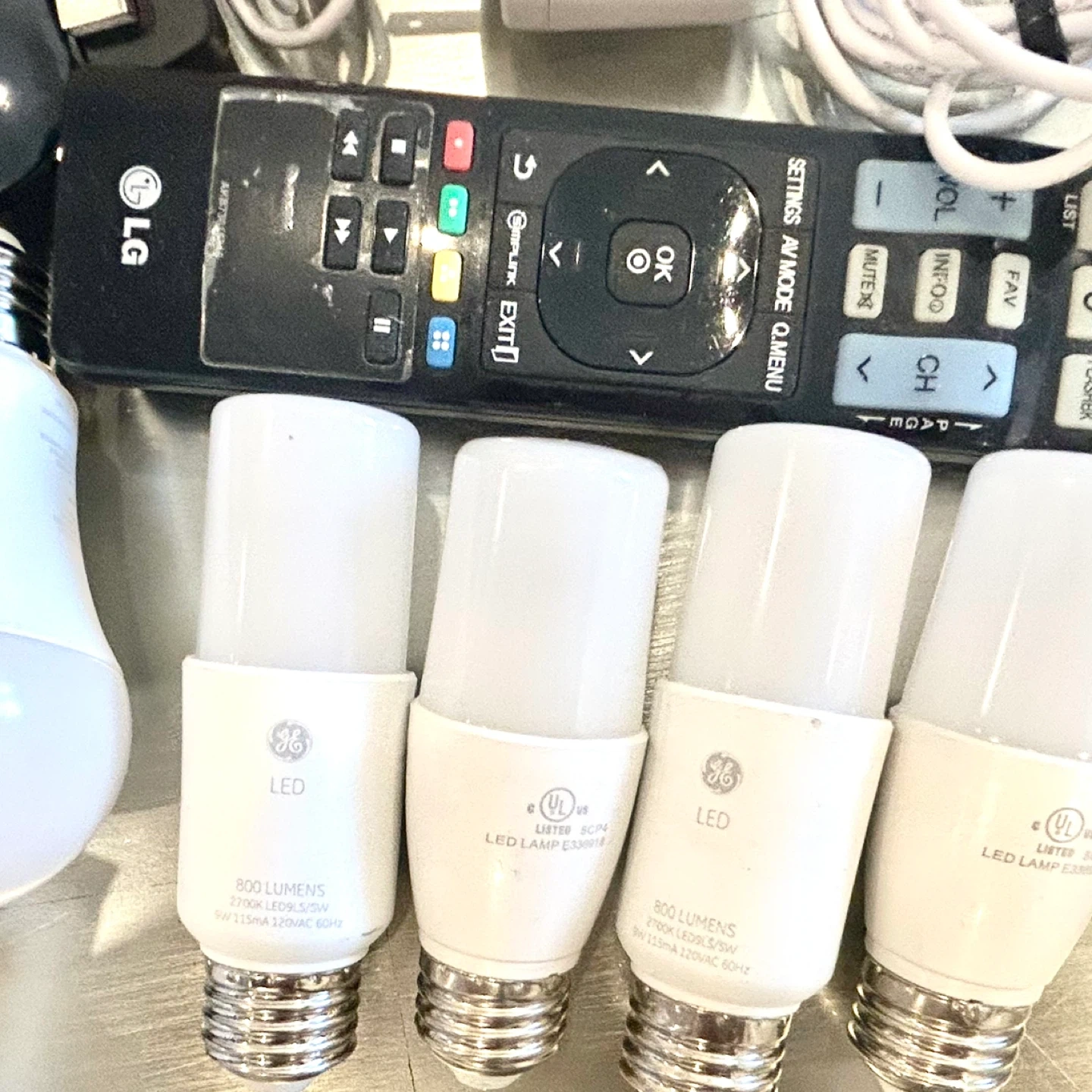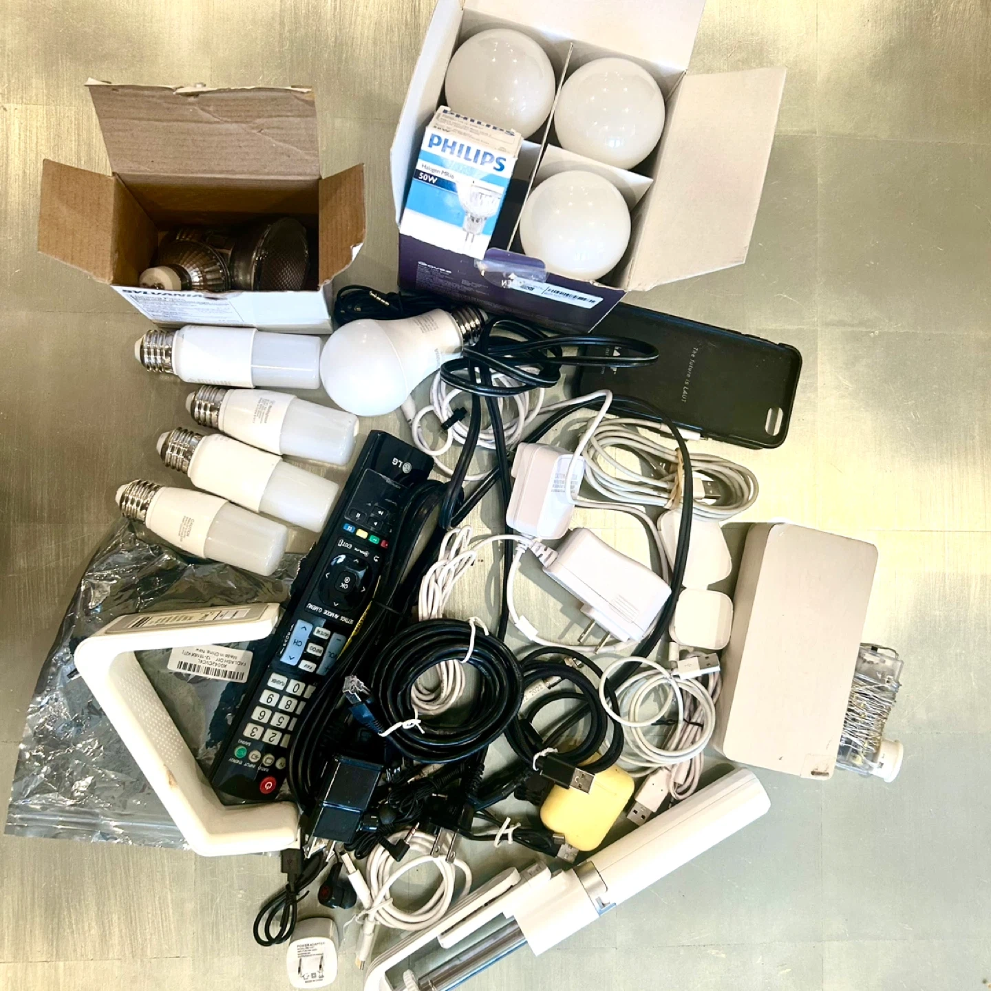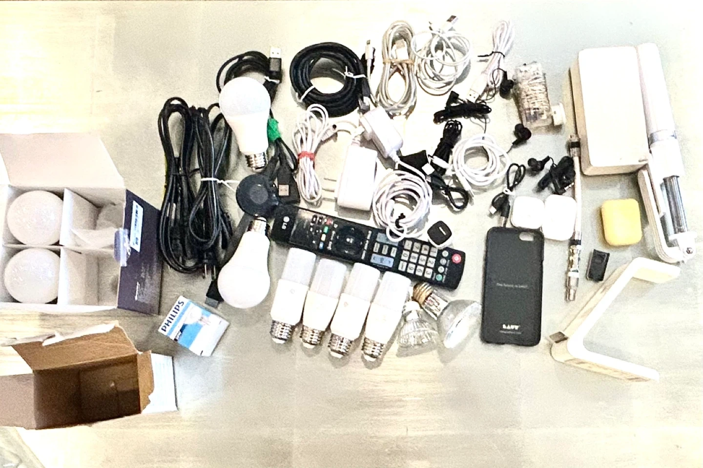 EVERYTHING WORKS! Items include Philips light LED bulbs, GE LED bulbs, SYLVANIA Bluetooth smart bulb, LG remote, various cables, c charger, iPhone charger, usb, alarm clock from Germany , selfy stick, iPhone/iwatch/earpod charger, chrome tv, and other electronics. Great for someone looking for spare parts or replacements!