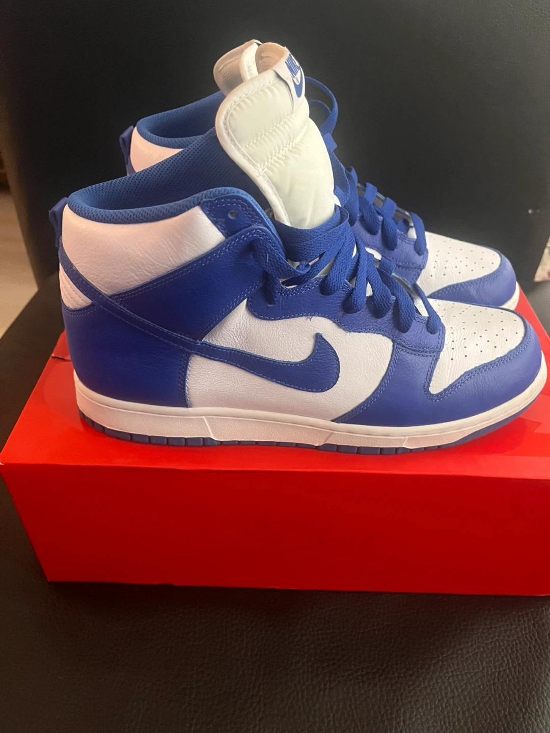 Selling a pair of Nike Dunk High Retro sneakers in the White/Racer Blue colourway. They come with the original box and an extra set of laces. These are a classic and stylish choice for everyday wear!