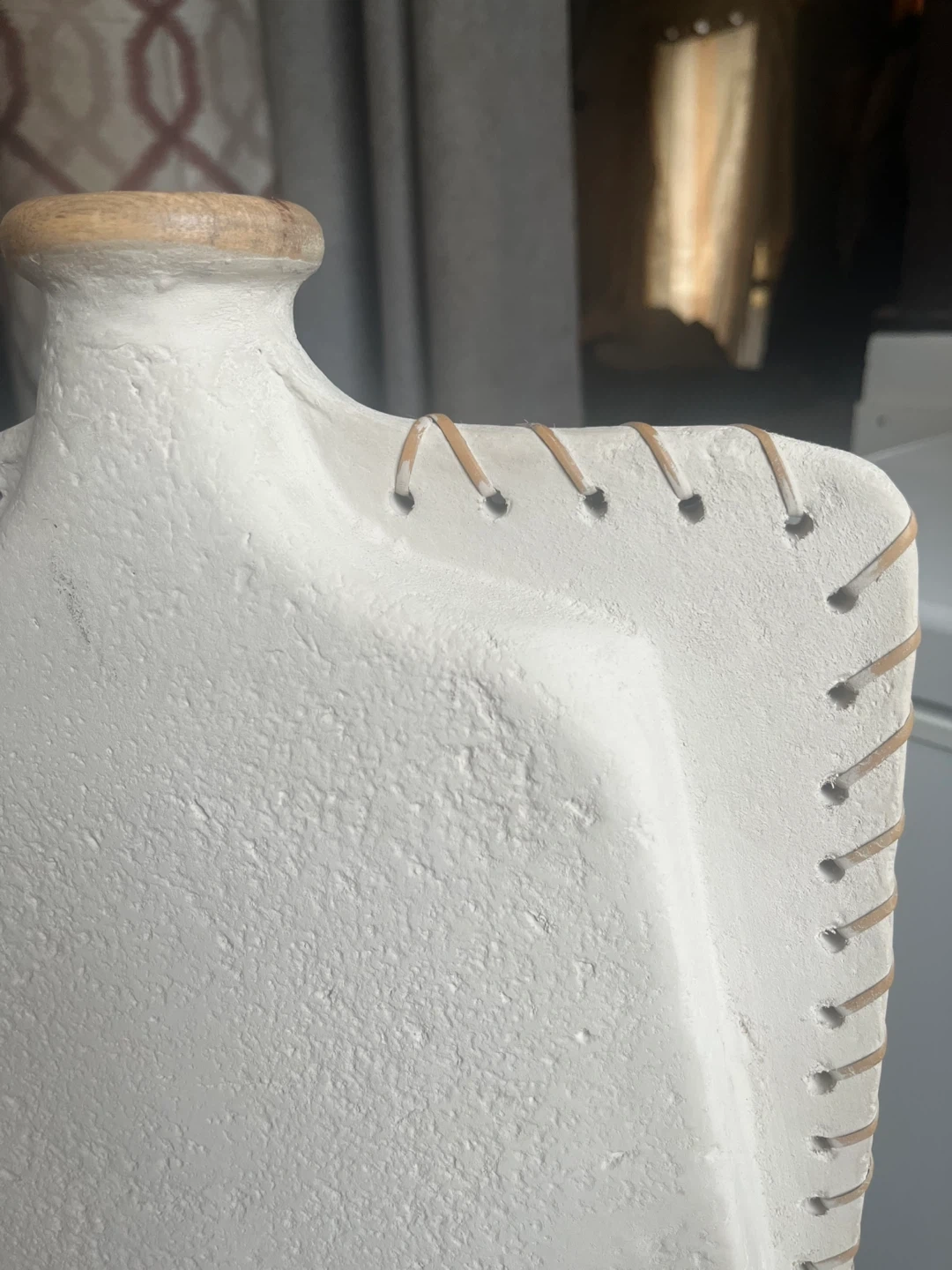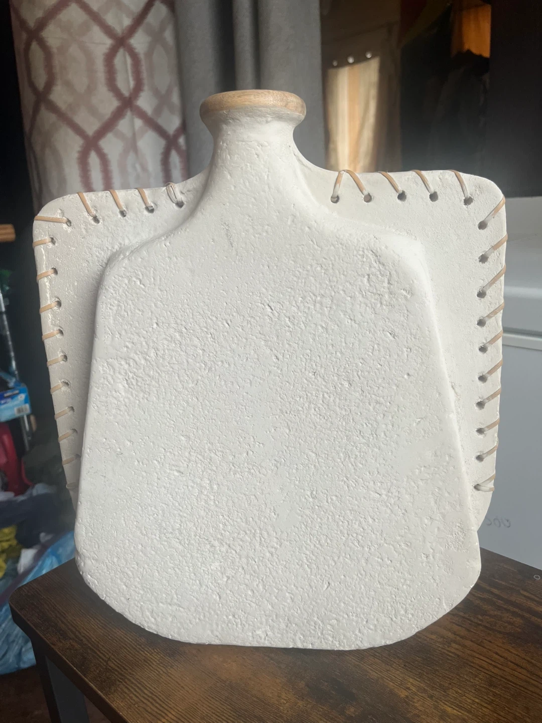 This is a lovely decorative vase, perfect for adding a touch of rustic charm to your home. It features a unique design with a textured white finish and a wooden top accent. It's in great condition and ready to brighten up any space!