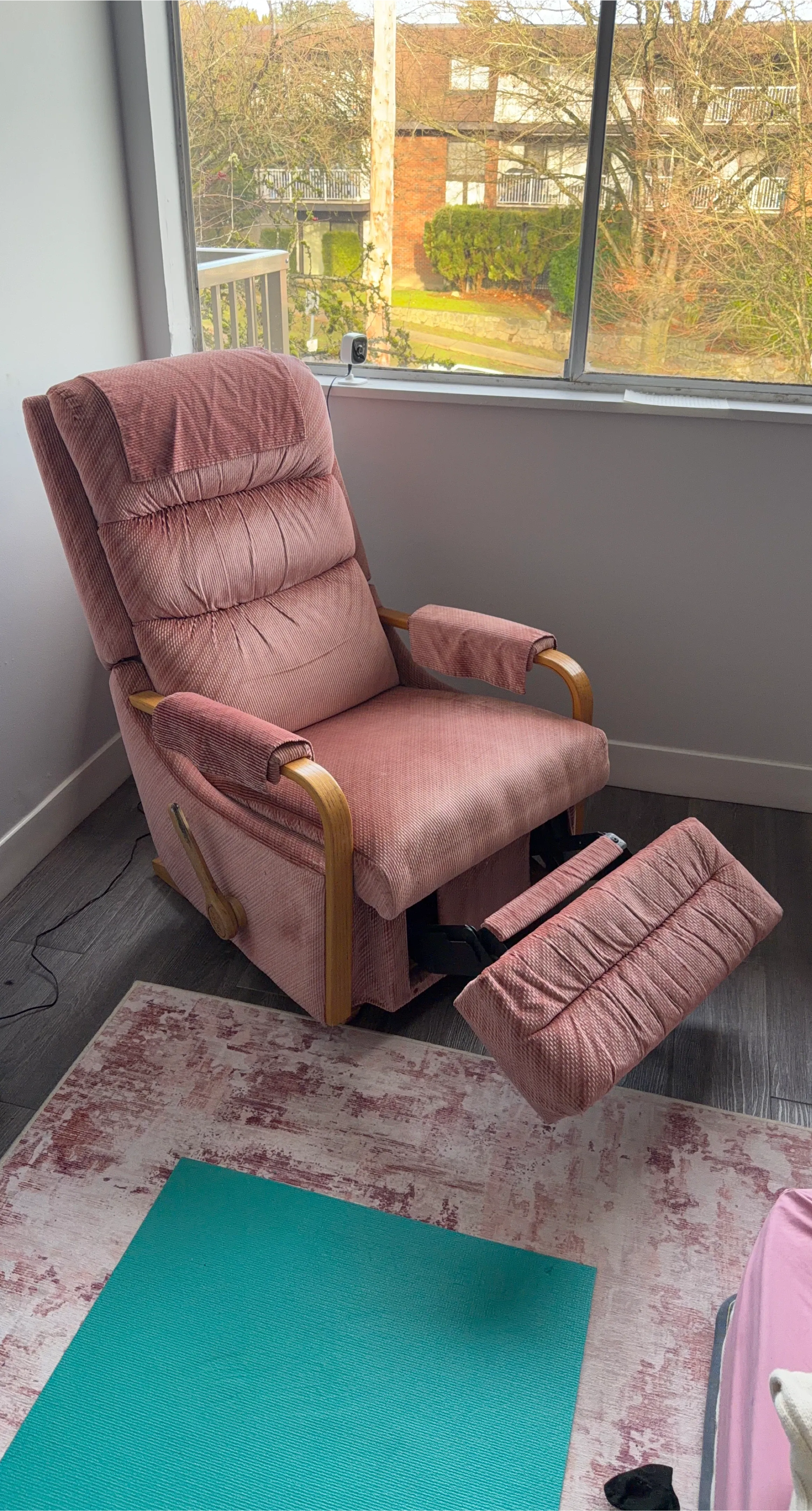 Selling a comfy pink recliner chair! It's perfect for relaxing after a long day. The chair is in good condition and has a footrest that pops out with a lever on the side