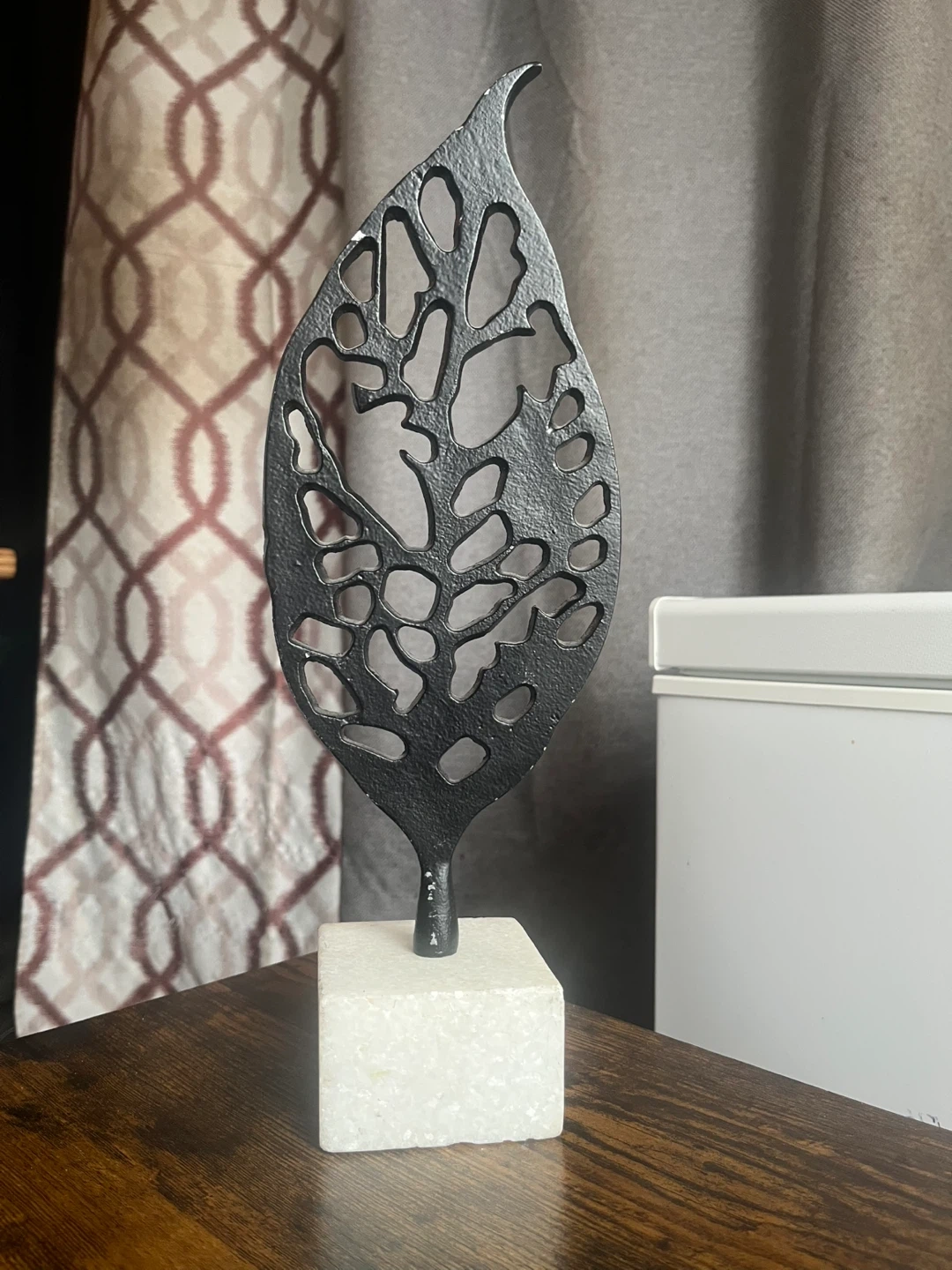 This is a lovely metal leaf sculpture mounted on a marble base. It would look great as a decorative piece in any room of your house!