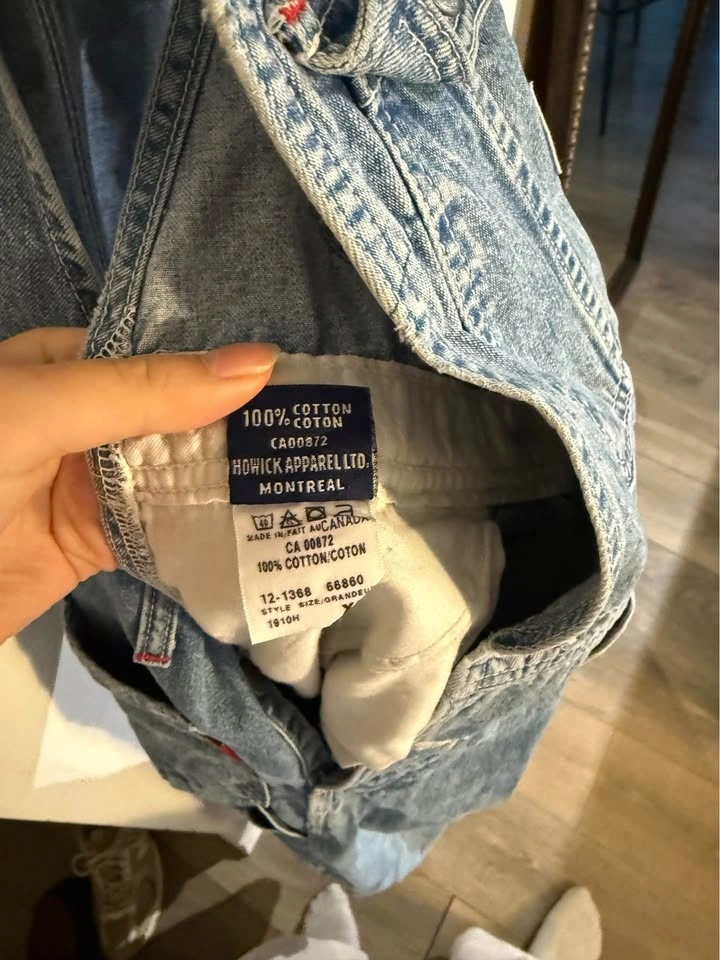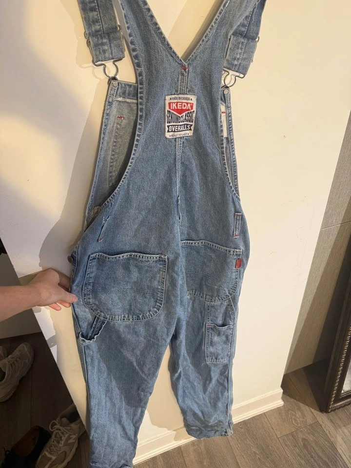 Authentic vintage IKEDA denim overalls, made in Canada. Classic blue workwear denim with adjustable straps, multiple utility pockets, and original IKEDA patches. 100% cotton, heavy-duty construction. Excellent condition. Priced at $40.