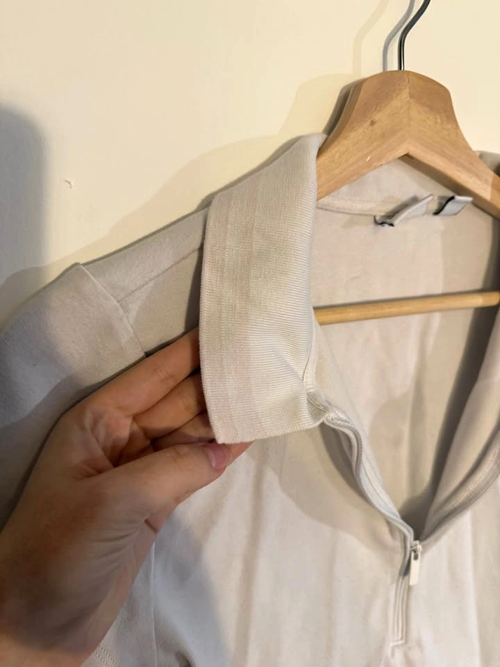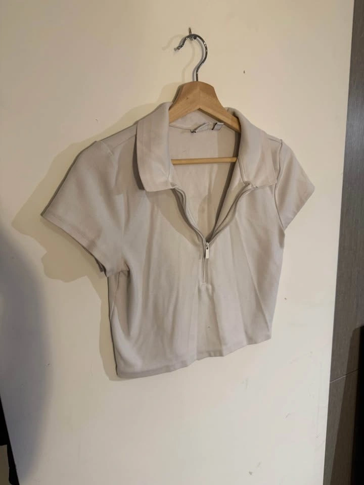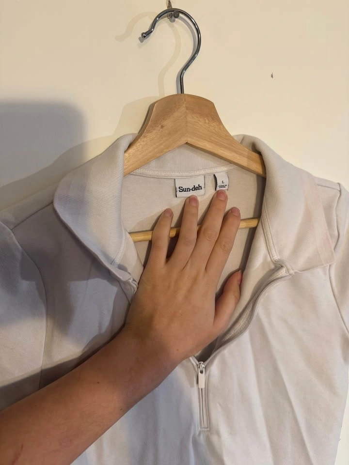 Sundeh short-sleeve half-zip polo top in a light beige/stone colour — size L. Soft, stretchy fabric with structured collar and functional front zipper. Minimal, elevated casual piece. Well taken care of, lightly worn, no noticeable flaws. Priced at $25.