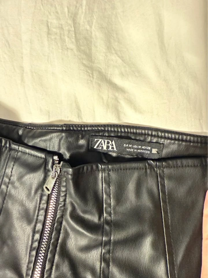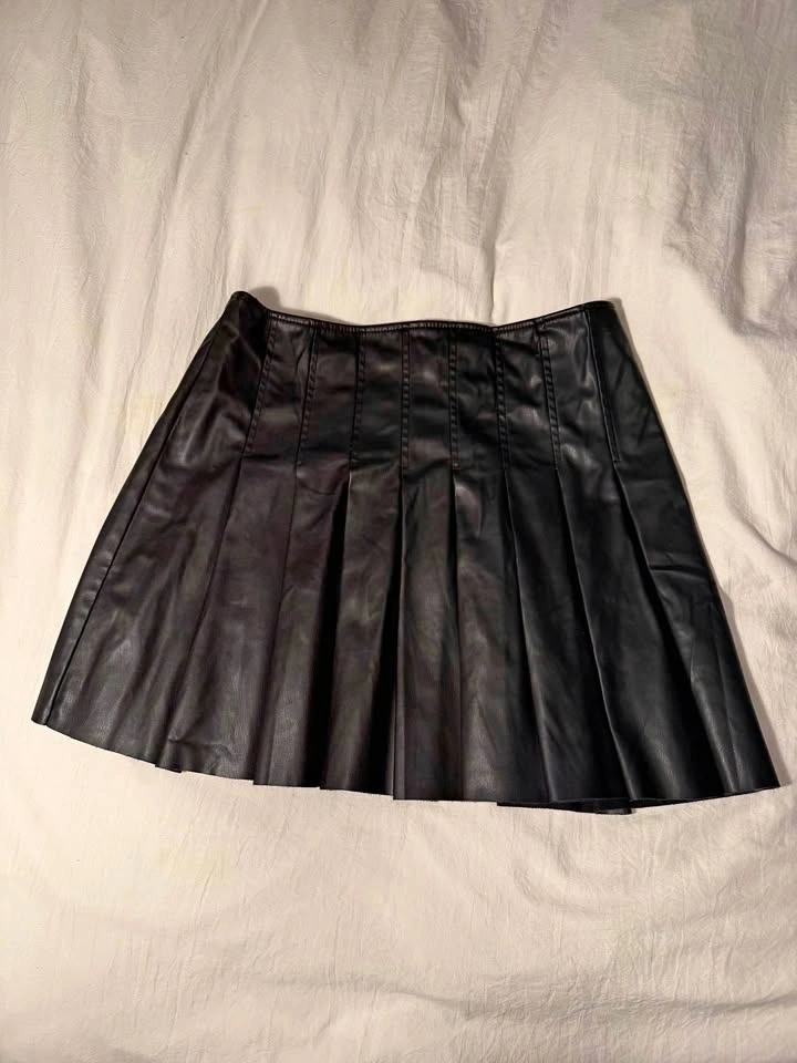 Black faux leather pleated mini skirt from Zara. Structured pleats with a clean A-line silhouette and back zip closure. Classic, edgy piece that works year-round — easy to dress up or down. Very good condition.