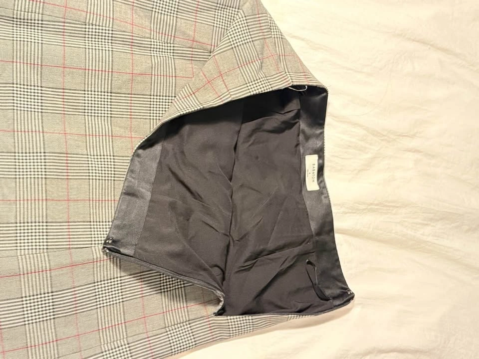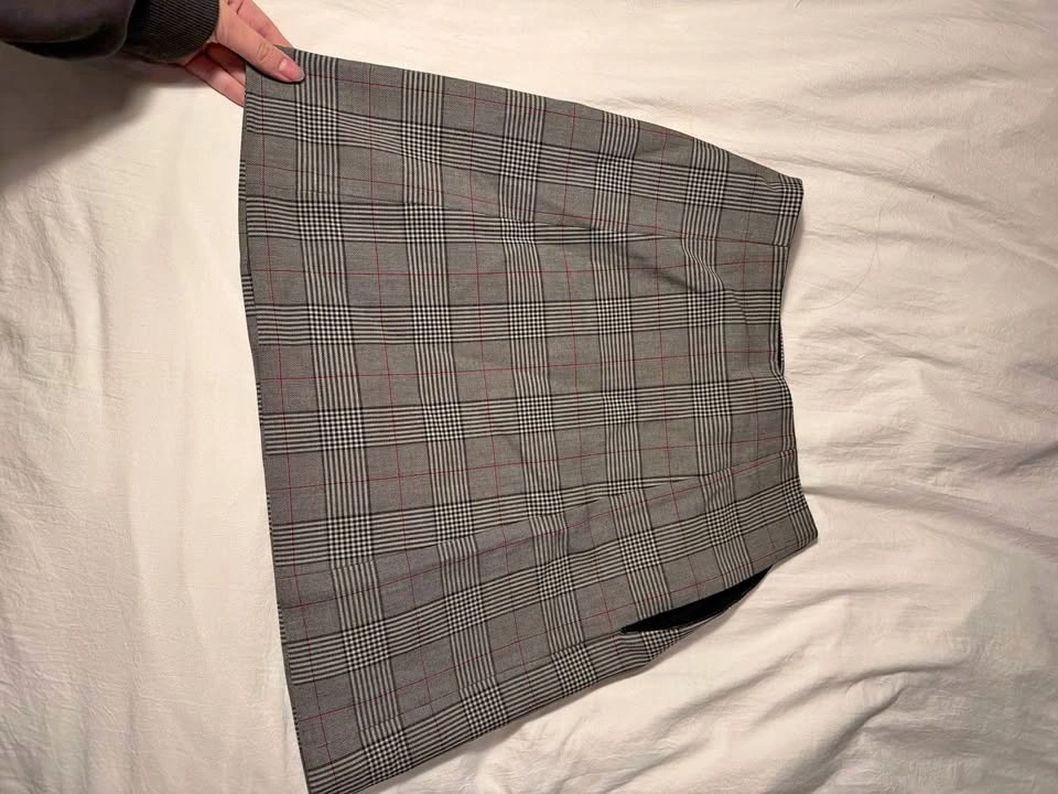 Details: Structured mini length, timeless grey plaid with subtle red lines, fully lined — perfect for fall/winter with boots or tights