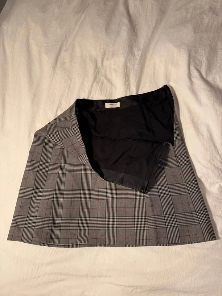Details: Structured mini length, timeless grey plaid with subtle red lines, fully lined — perfect for fall/winter with boots or tights