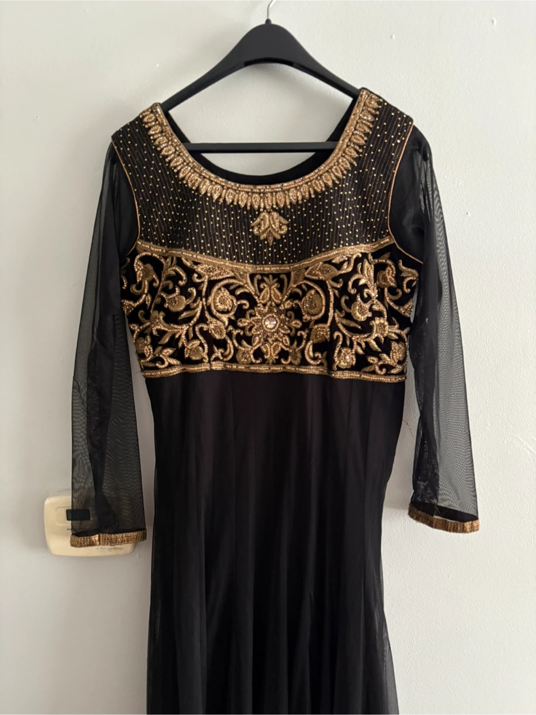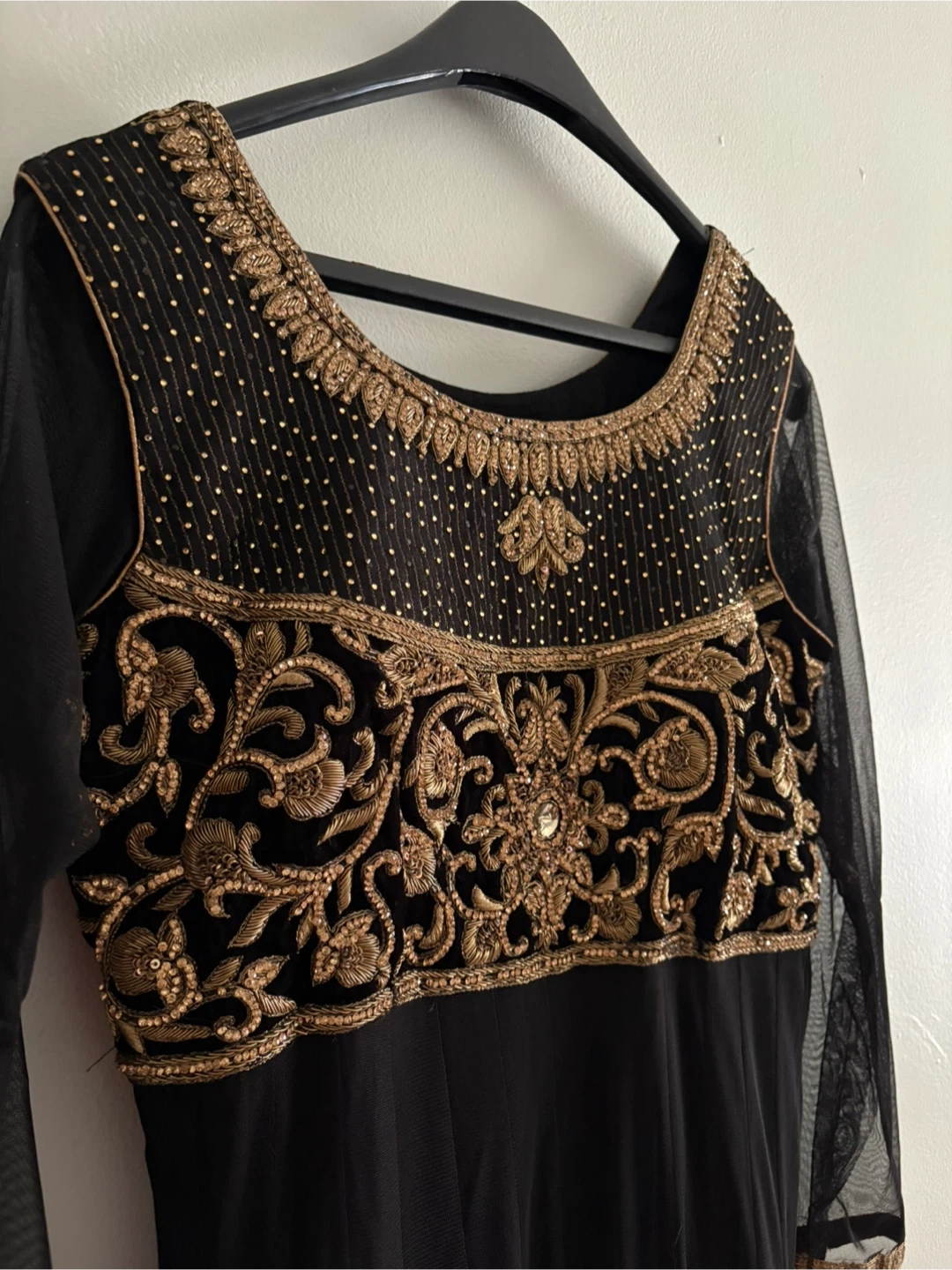Beautiful black Anarkali dress with intricate gold embroidery. It's in great condition and perfect for a special occasion! The dress features a flowing skirt and elegant design.