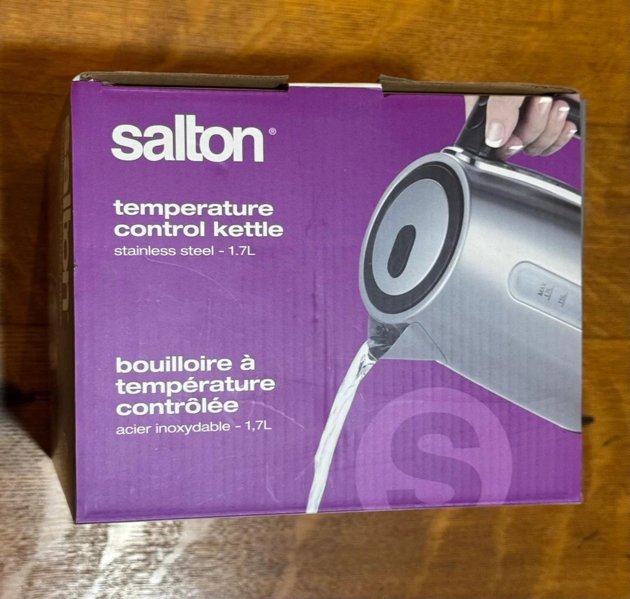 I'm selling a brand new Salton temperature control kettle, never used! It's stainless steel and has a 1.7L capacity. It features 7 temperature settings, a 2-hour keep warm function, and displays in Celsius or Fahrenheit. It also has boil-dry protection and automatically shuts off when water starts boiling in dry condition. The kettle boils as little as 2 cups (500 ml) of water and has a 360° base. The box is included!