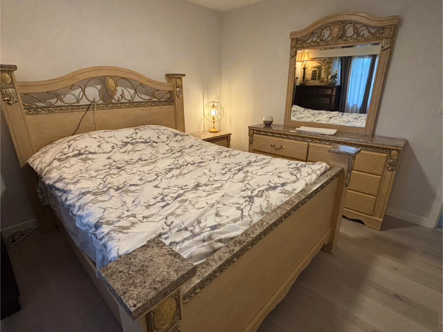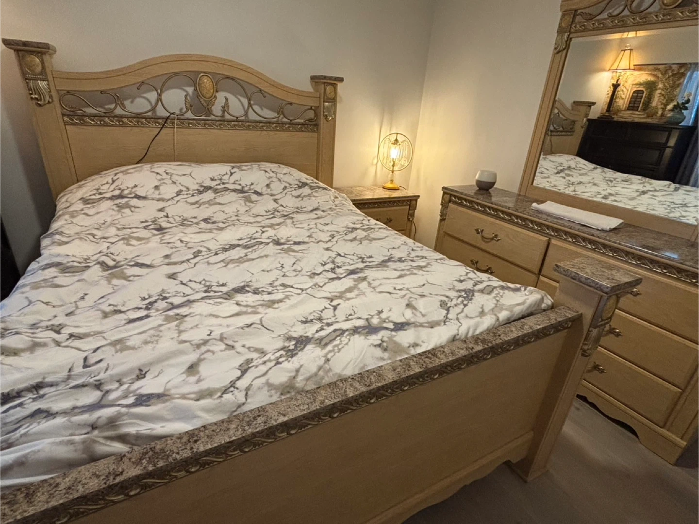 Selling a bedroom set that includes a bed dresser mirror and bedside table. The set has a unique design with decorative accents. It's in good condition and ready to add a touch of elegance to your bedroom