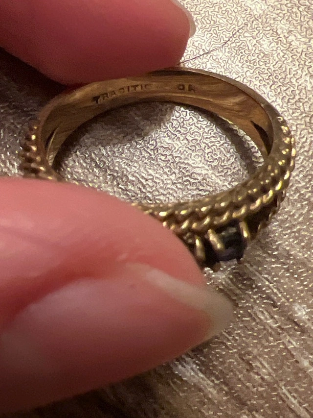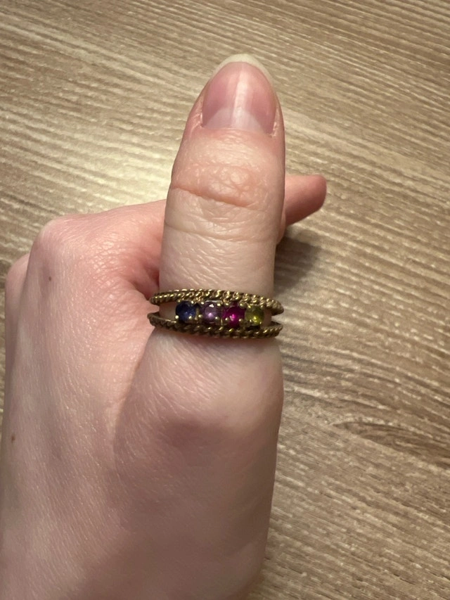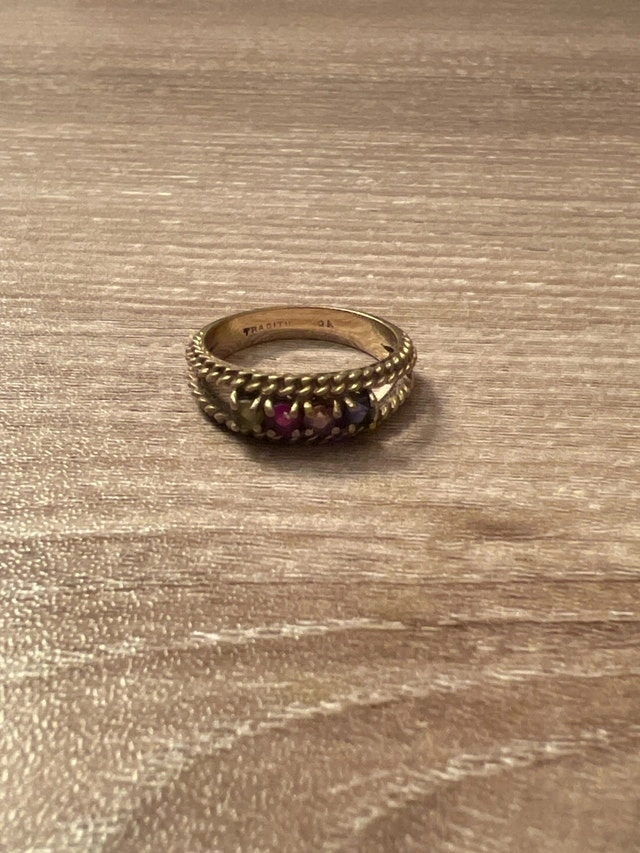 Beautiful vintage solid 9-carat gold ring featuring an elegant braided/wheat band design with a row of multi-coloured natural gemstones (blue, purple, pink/red, and yellow). A timeless, classic piece that works perfectly as an everyday ring or a unique vintage statement. The inside of the band is hallmarked “TRADITION 9K”, confirming solid gold. The ring has a lovely warm gold tone and a comfortable, substantial feel on the finger.