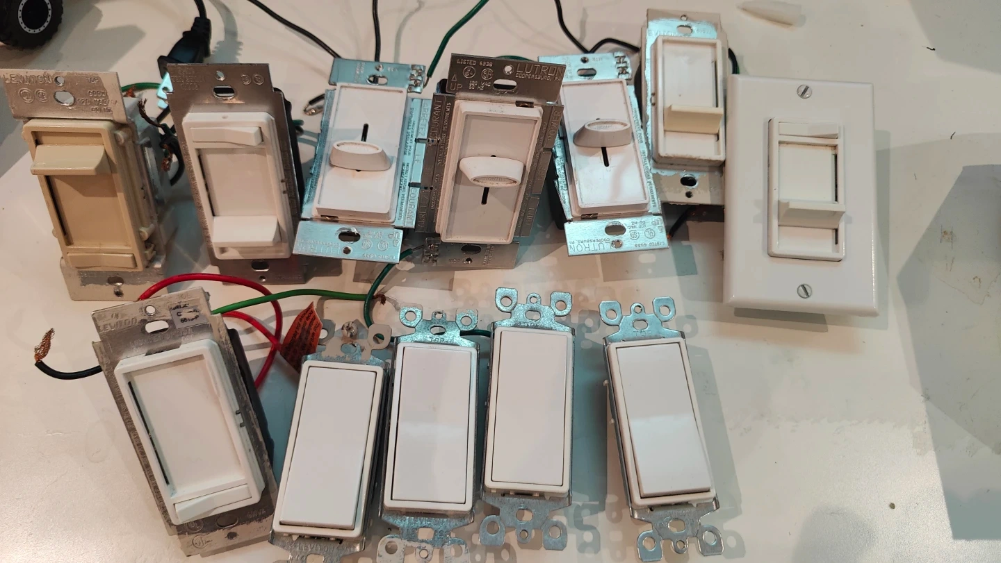 A mix of Leviton and Lutron light dimmers and switches. These are perfect for adjusting the brightness in your home and creating the right ambiance. Great for any DIY project or home renovation