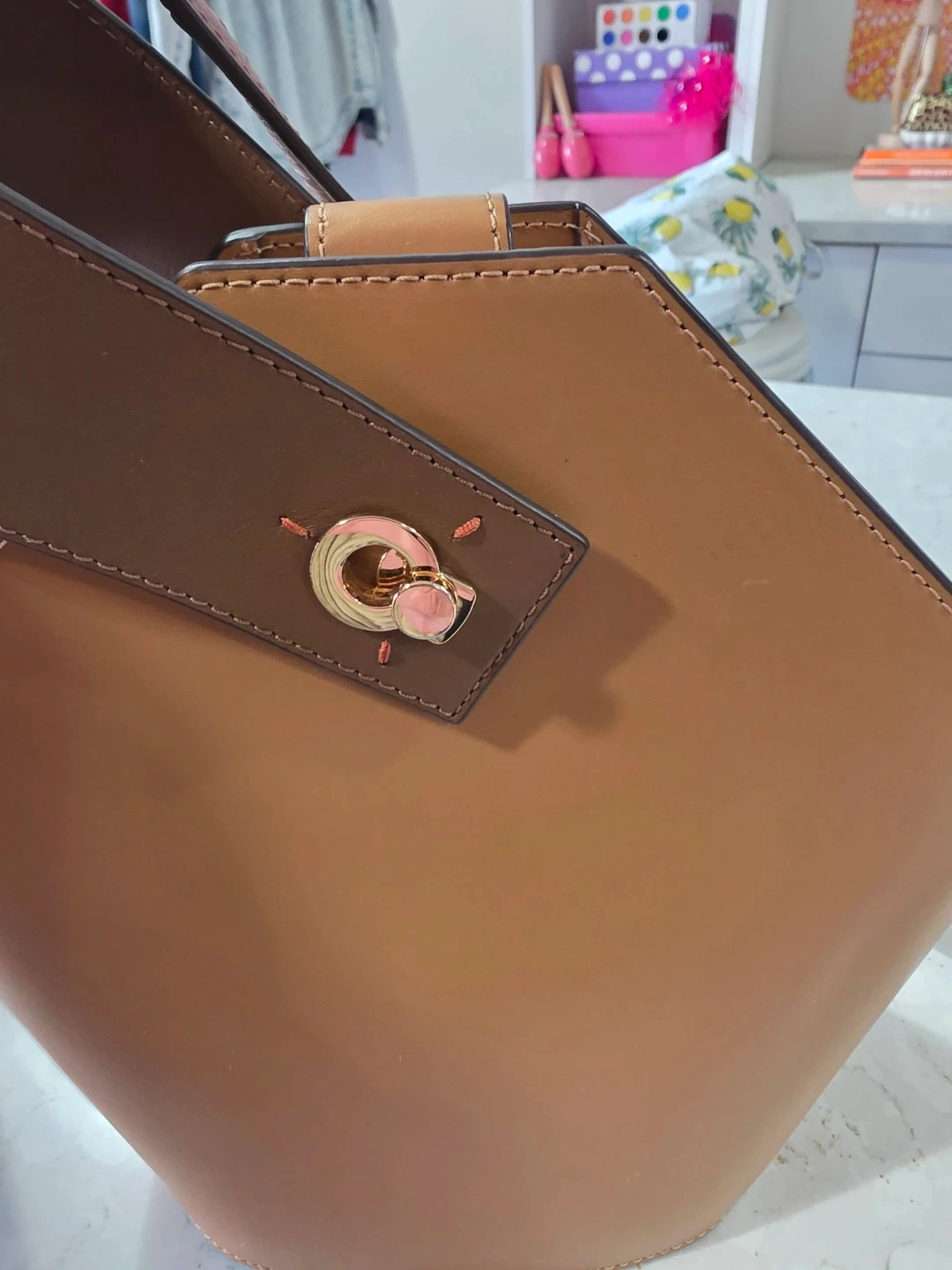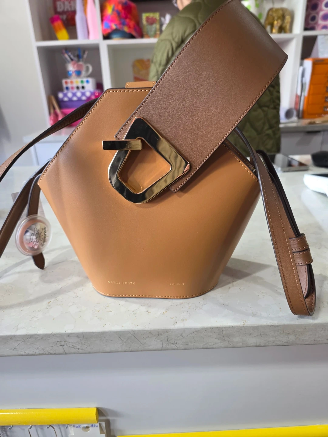 Mini Johnny Leather Hexagonal Bucket Bag in tan leather. It's in As NEW condition and ready for a new owner! The unique design and quality craftsmanship make it a stylish accessory for any outfit.