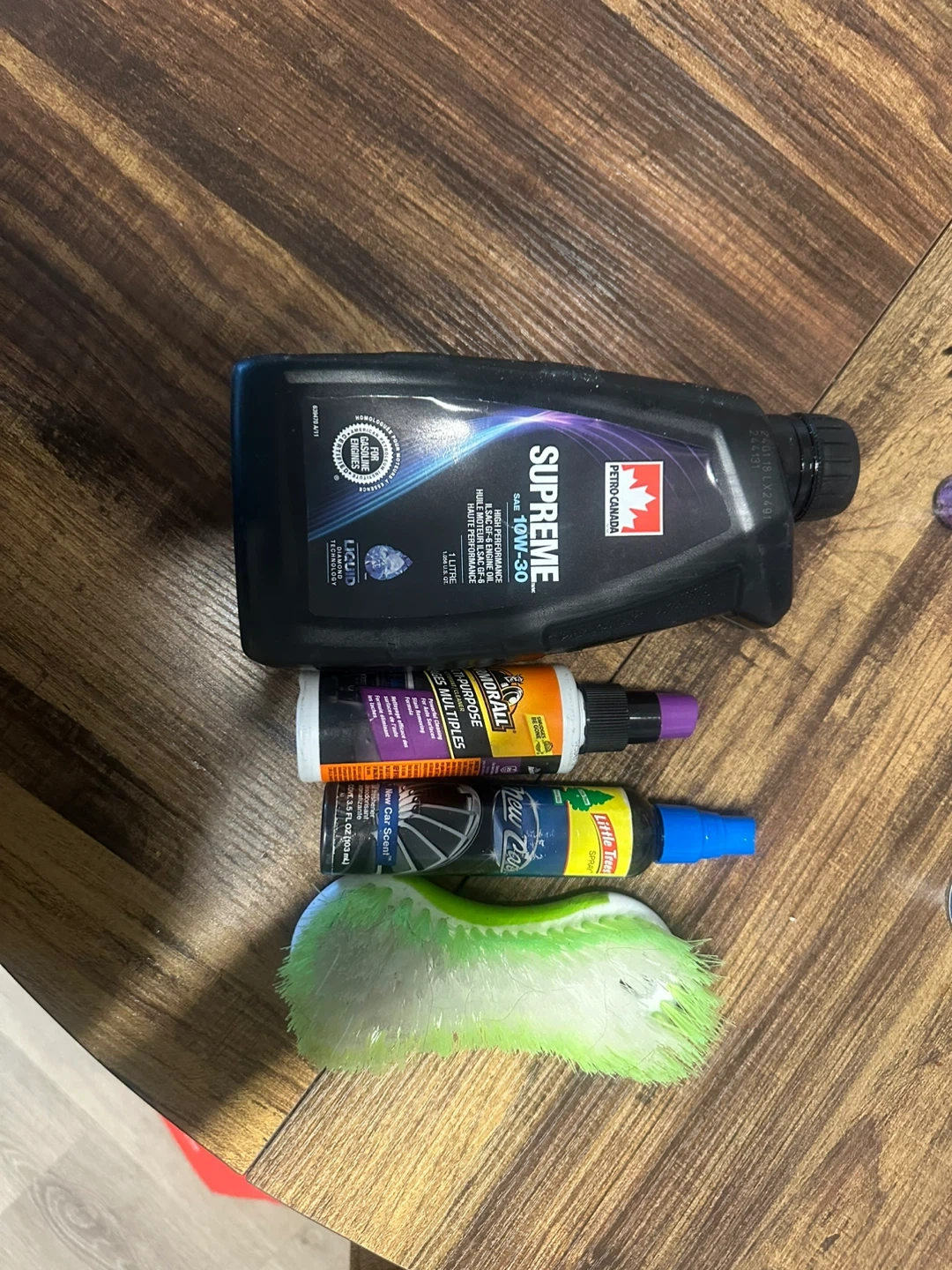 I have a 1-litre bottle of Petro-Canada Supreme SAE 10W-30 high-performance engine oil for sale. Also included are Armor All multi-purpose cleaner, Little Trees New Car Scent spray, and a cleaning brush