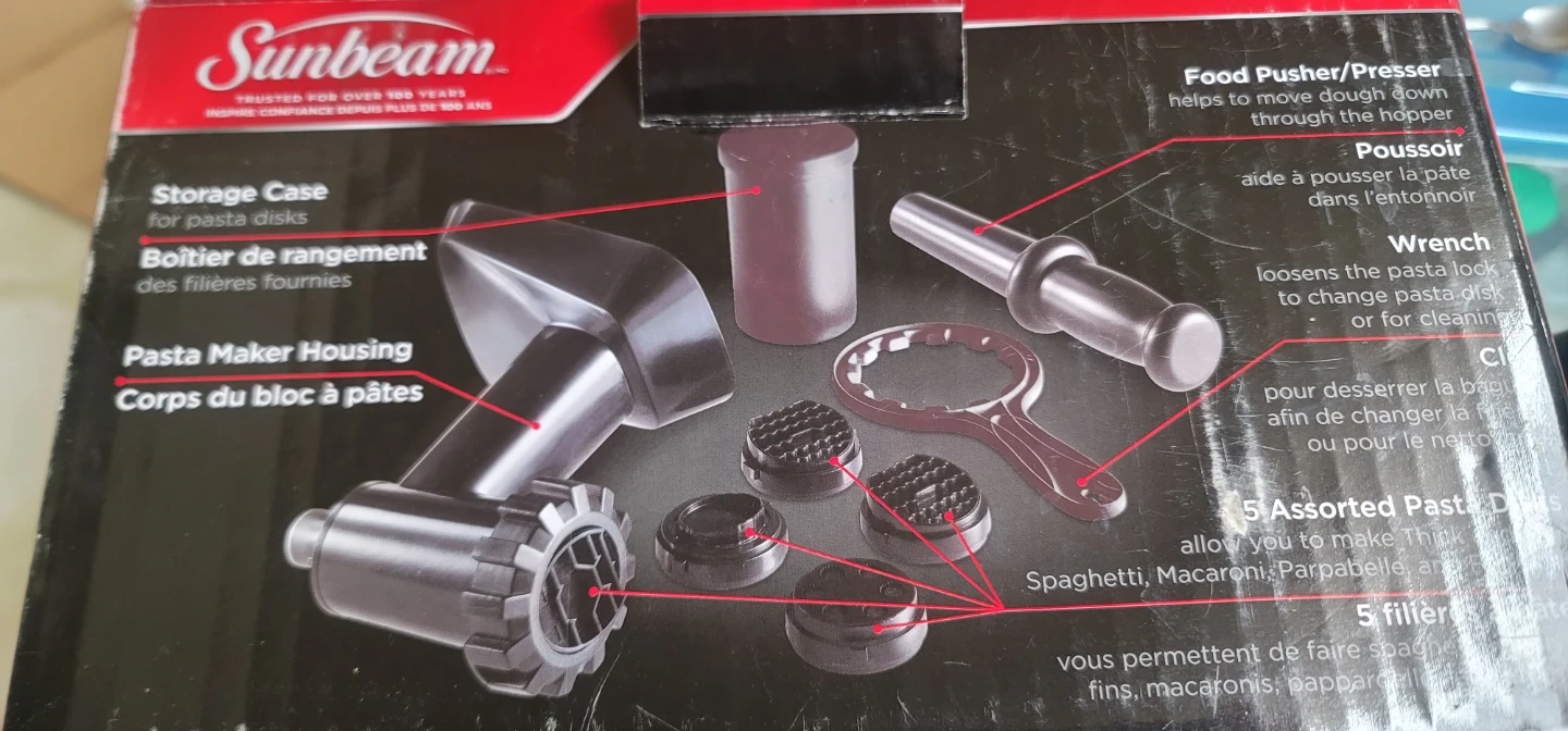 Selling a Sunbeam pasta maker housing with assorted pasta disks. It includes a storage case for the disks, a food pusher/presser, and a wrench to change the pasta disk. Allows you to make spaghetti, macaroni, and more!